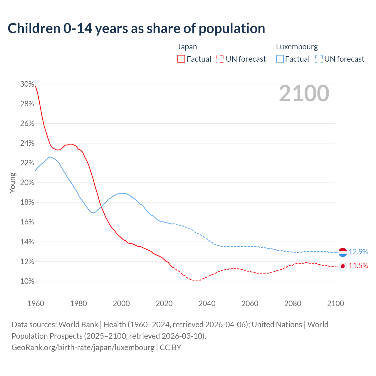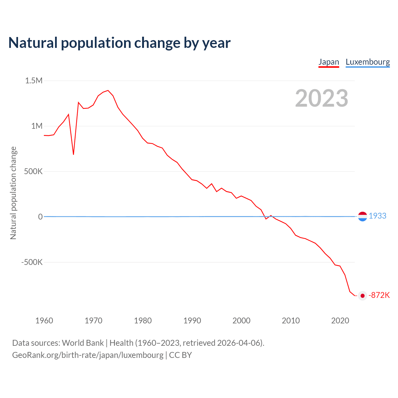 According to the latest available data on birth rates, the fertility rate in Japan was 1.2 children per woman in 2023, compared to 1.25 in Luxembourg in 2023. The replacement level is considered to be 2.1 children per woman.