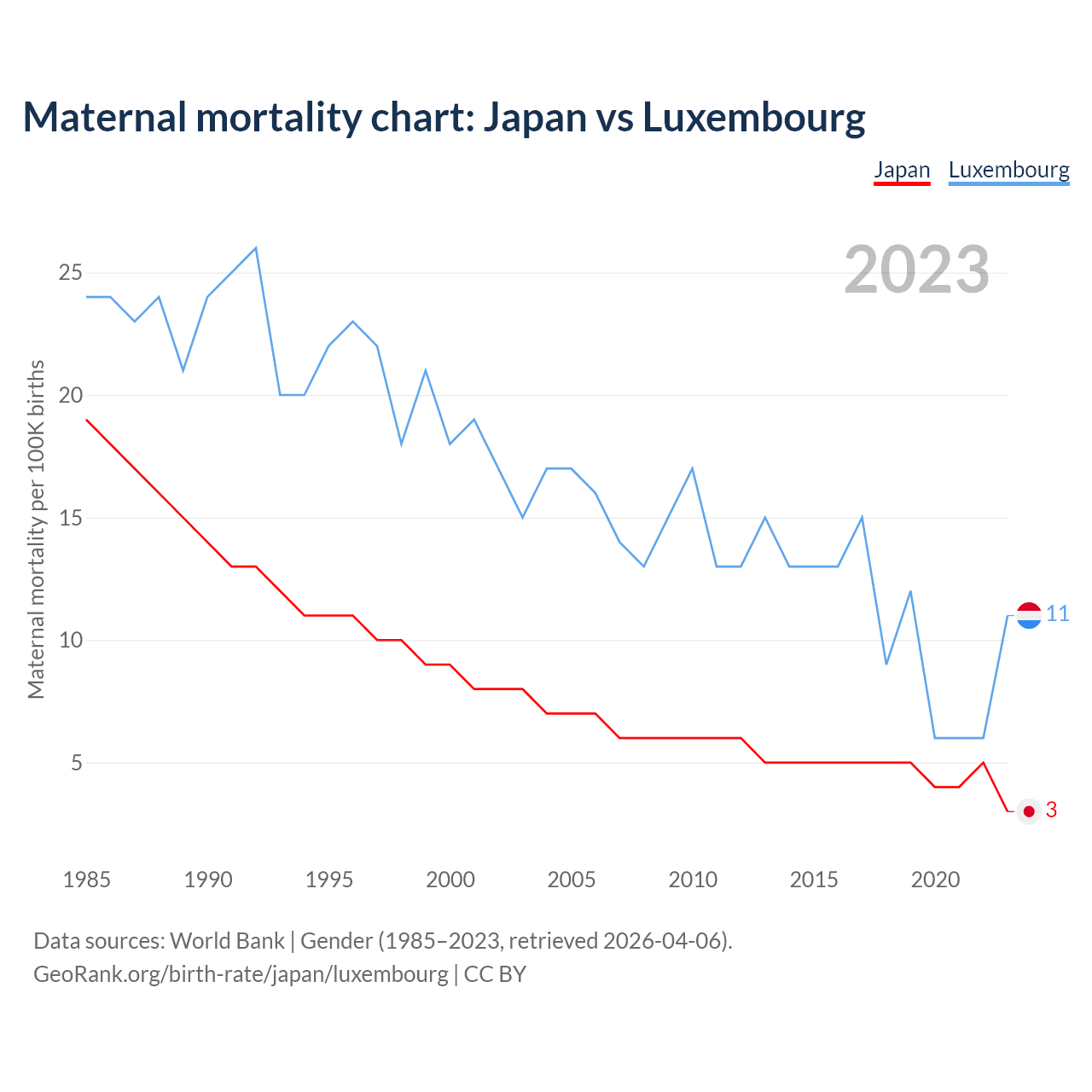 The maternal mortality rate, which is the probability of dying during childbirth or within 42 days of pregnancy termination, is 3 deaths per 100,000 live births in Japan, compared to 11 deaths in Luxembourg.