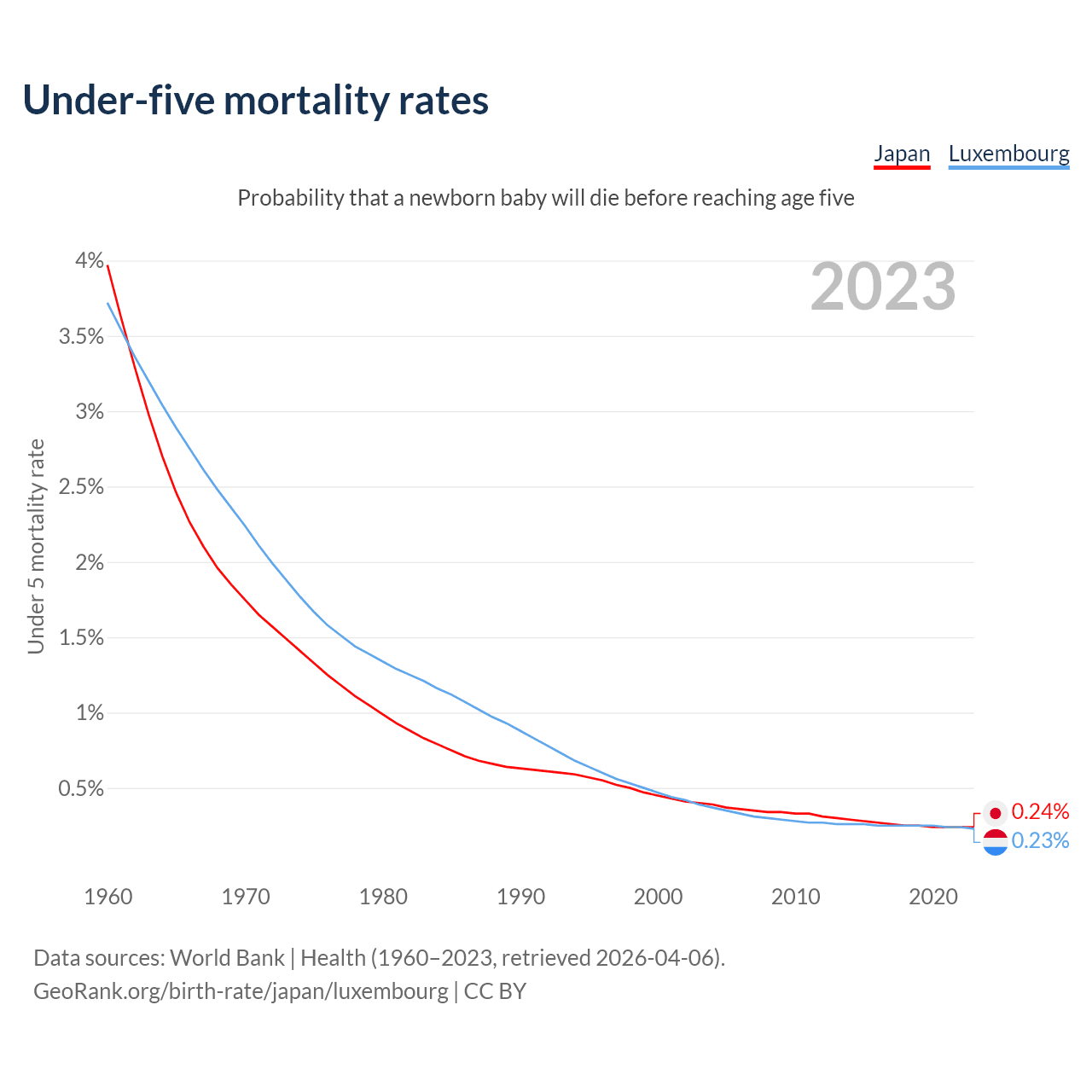 The chance that a newborn baby will die before reaching age five is 0.24% in Japan and 0.23% in Luxembourg. Above is a chart with historical data on under-five mortality rates.