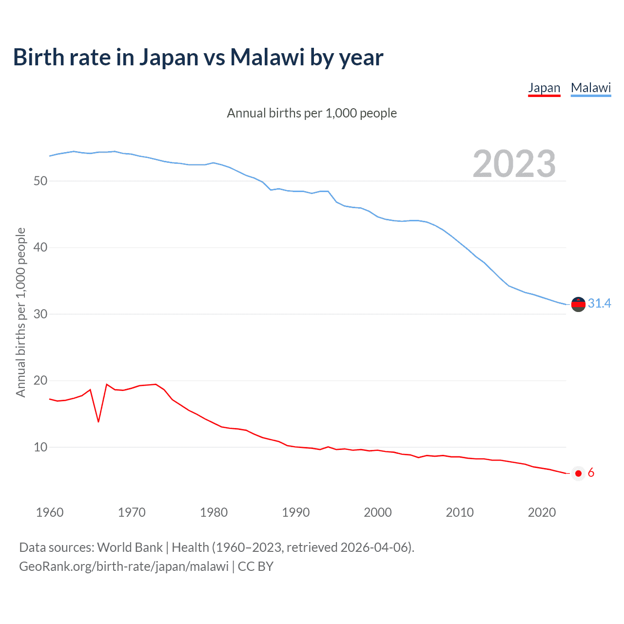 Japan has an annual birth rate of 6 births per 1,000 people, compared to 31.4 for Malawi. The average number of children a woman is expected to have during her lifetime — the fertility rate, is 1.2 in Japan and 3.65 in Malawi — 204% difference.