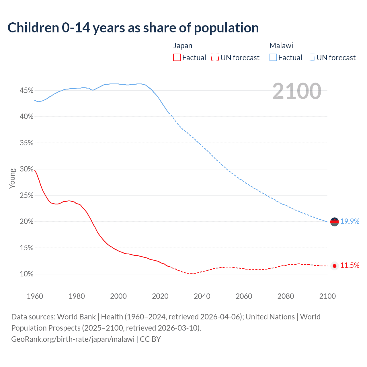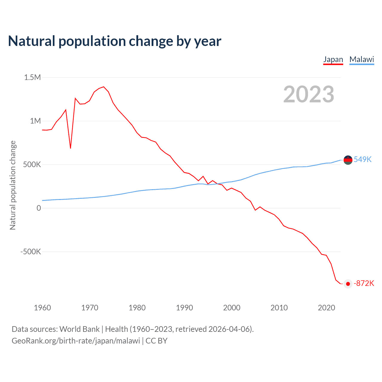 According to the latest available data on birth rates, the fertility rate in Japan was 1.2 children per woman in 2023, compared to 3.65 in Malawi in 2023. The replacement level is considered to be 2.1 children per woman.