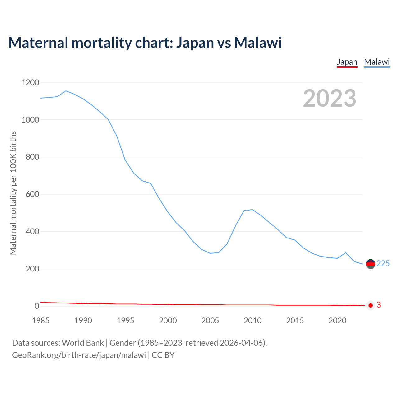 The maternal mortality rate, which is the probability of dying during childbirth or within 42 days of pregnancy termination, is 3 deaths per 100,000 live births in Japan, compared to 225 deaths in Malawi.