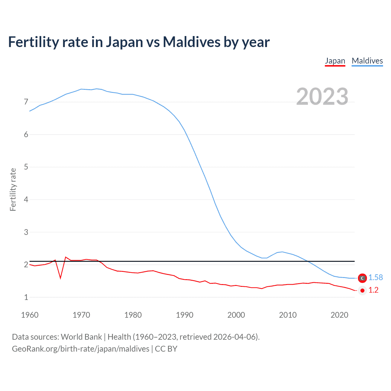 1960 vs 2023, the fertility rate has decreased by 40% in Japan and by 76.5% in Maldives — in 1960, it was 2 and 6.71, respectively.
