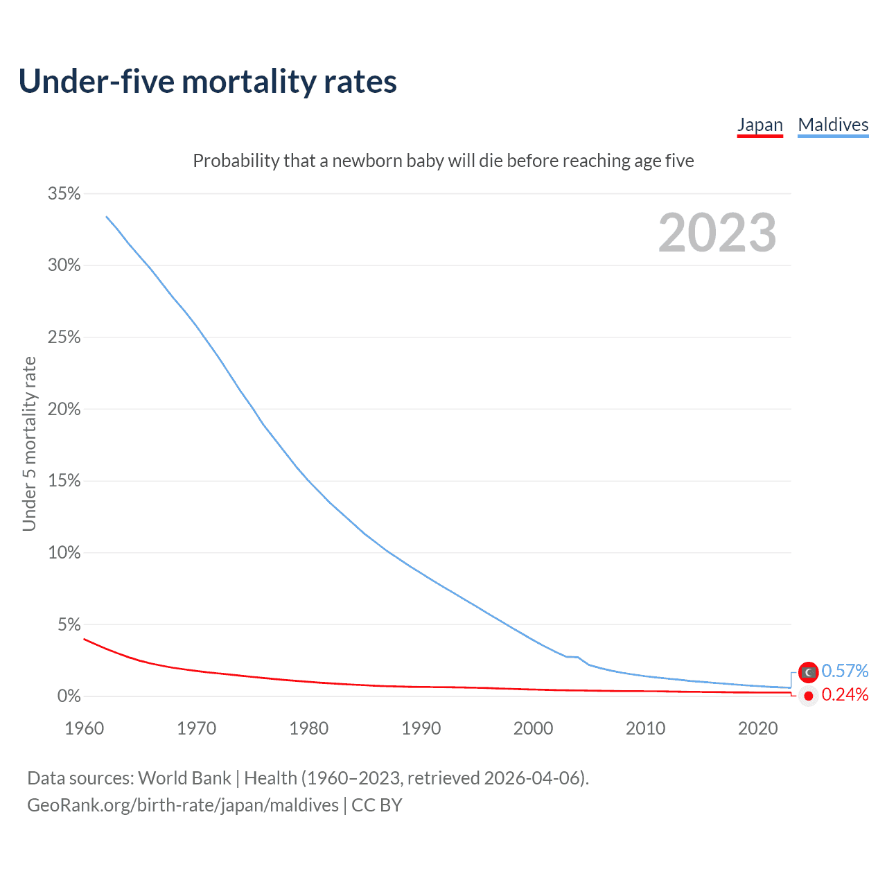 The chance that a newborn baby will die before reaching age five is 0.24% in Japan and 0.57% in Maldives. Above is a chart with historical data on under-five mortality rates.
