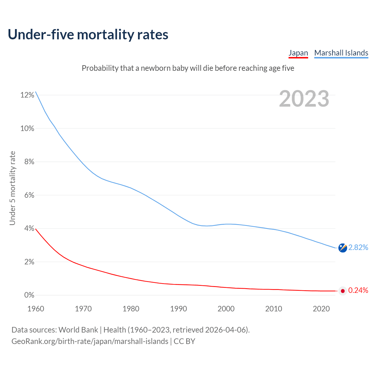 The chance that a newborn baby will die before reaching age five is 0.24% in Japan and 2.82% in the Marshall Islands. Above is a chart with historical data on under-five mortality rates.