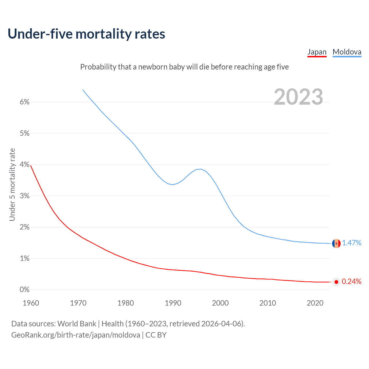 The chance that a newborn baby will die before reaching age five is 0.24% in Japan and 1.47% in Moldova. Above is a chart with historical data on under-five mortality rates.