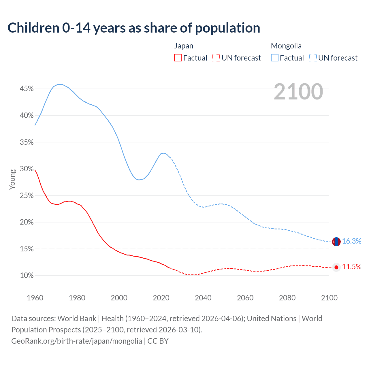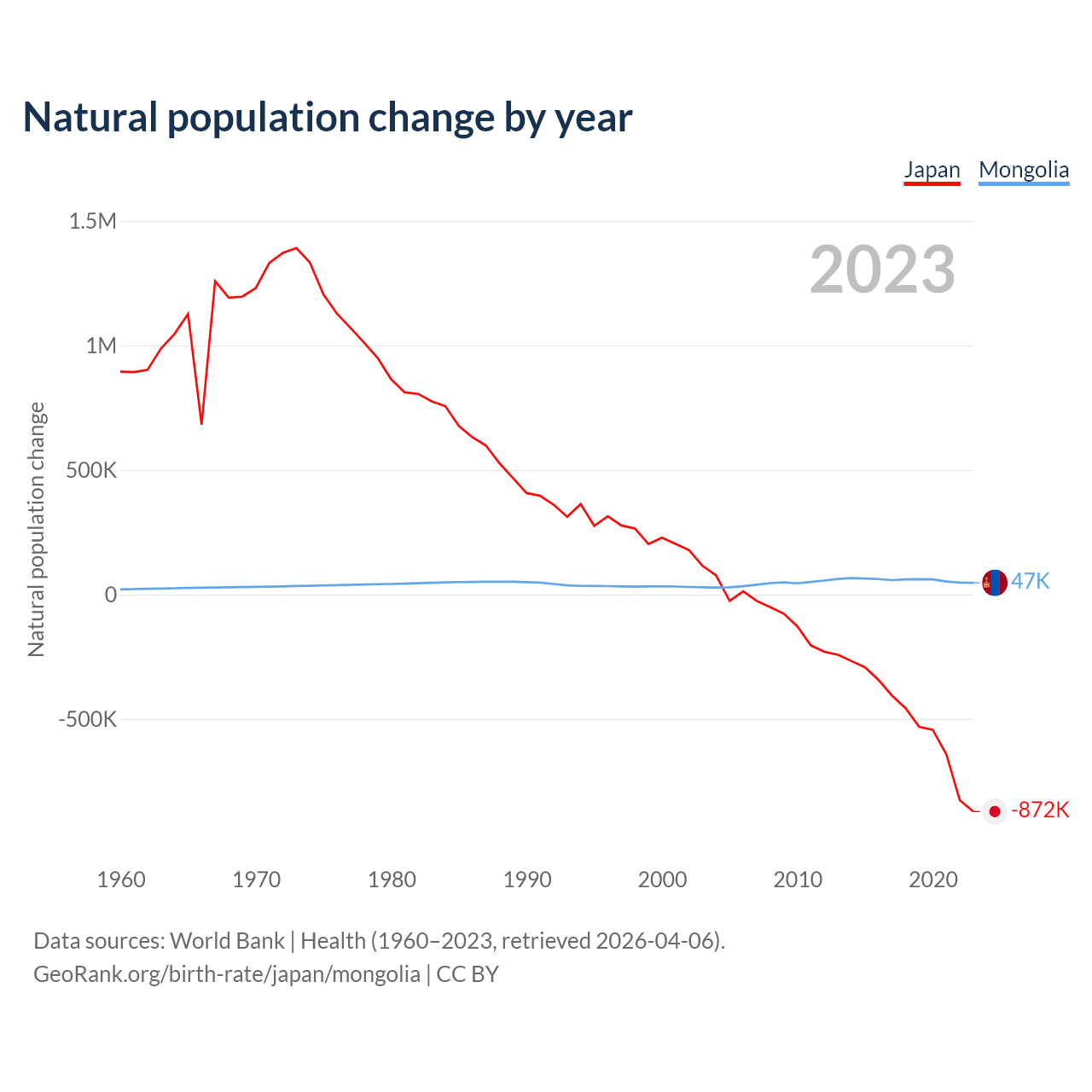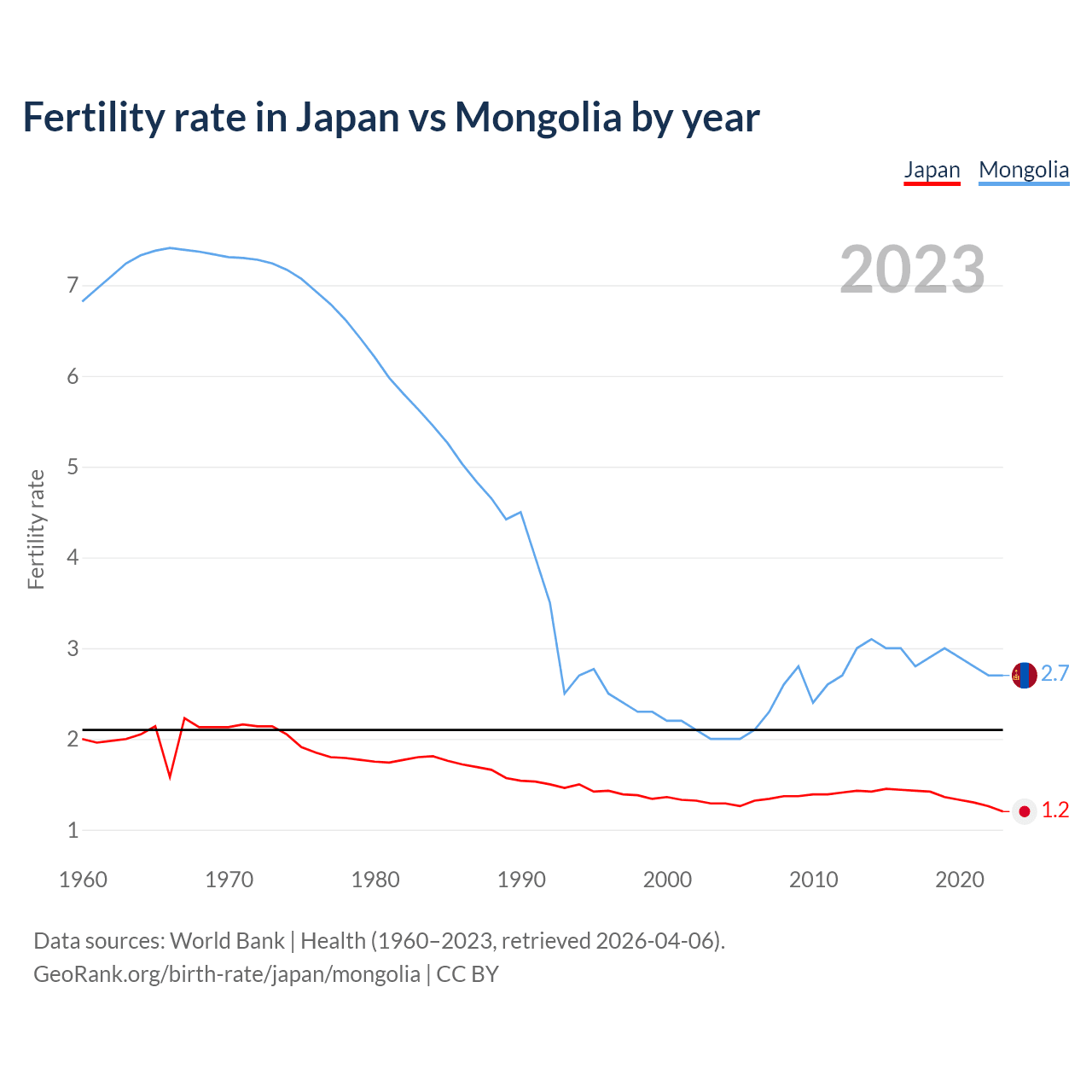 According to the latest available data on birth rates, the fertility rate in Japan was 1.2 children per woman in 2023, compared to 2.7 in Mongolia in 2023. The replacement level is considered to be 2.1 children per woman.