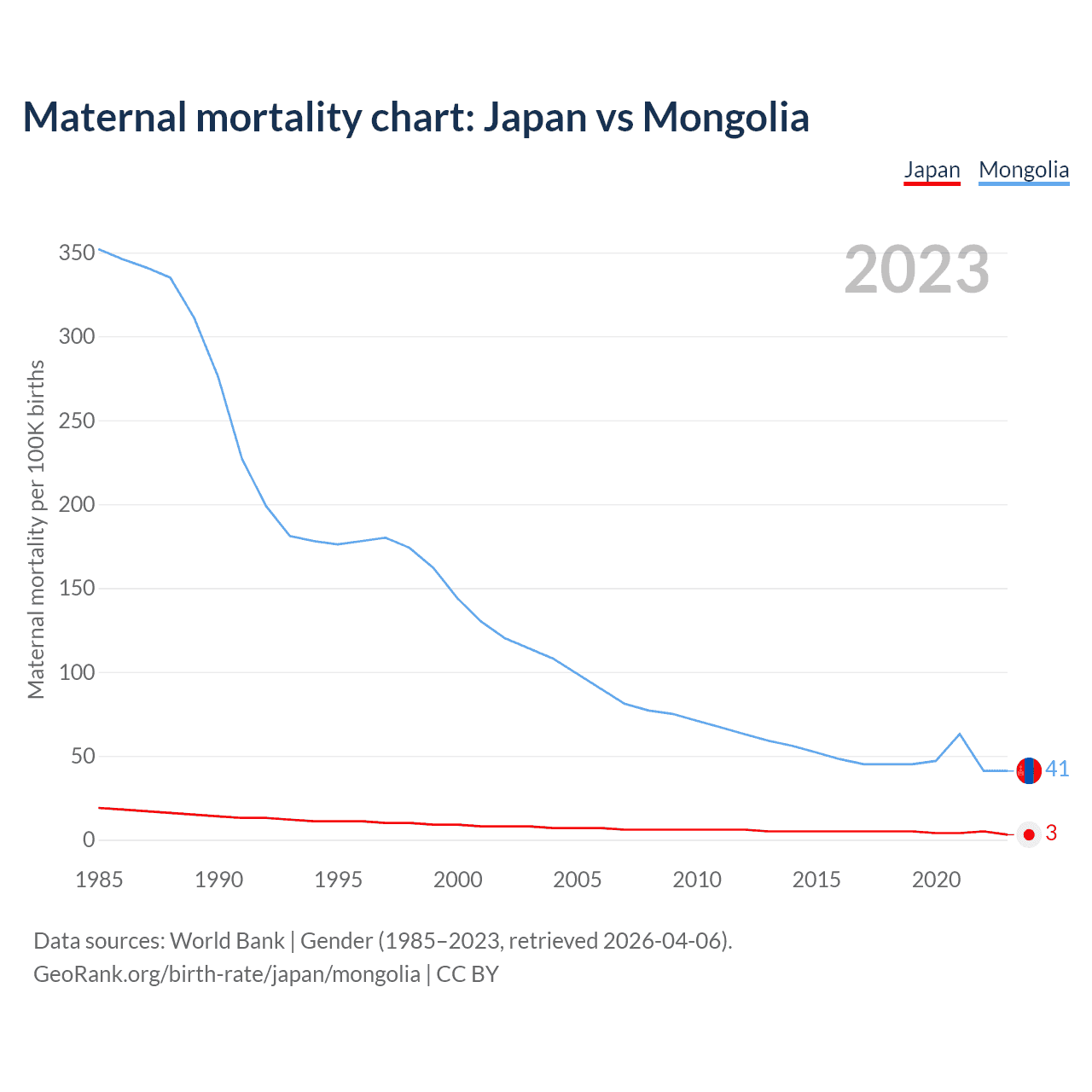 The maternal mortality rate, which is the probability of dying during childbirth or within 42 days of pregnancy termination, is 3 deaths per 100,000 live births in Japan, compared to 41 deaths in Mongolia.