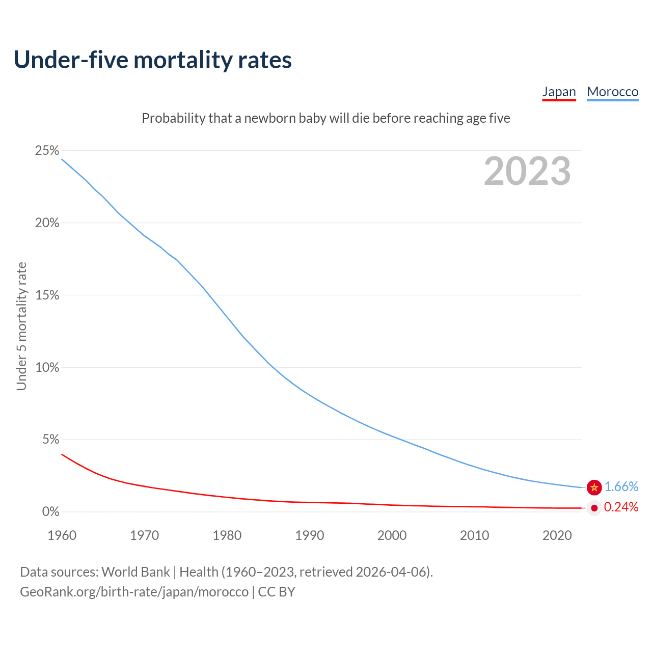 The chance that a newborn baby will die before reaching age five is 0.24% in Japan and 1.66% in Morocco. Above is a chart with historical data on under-five mortality rates.