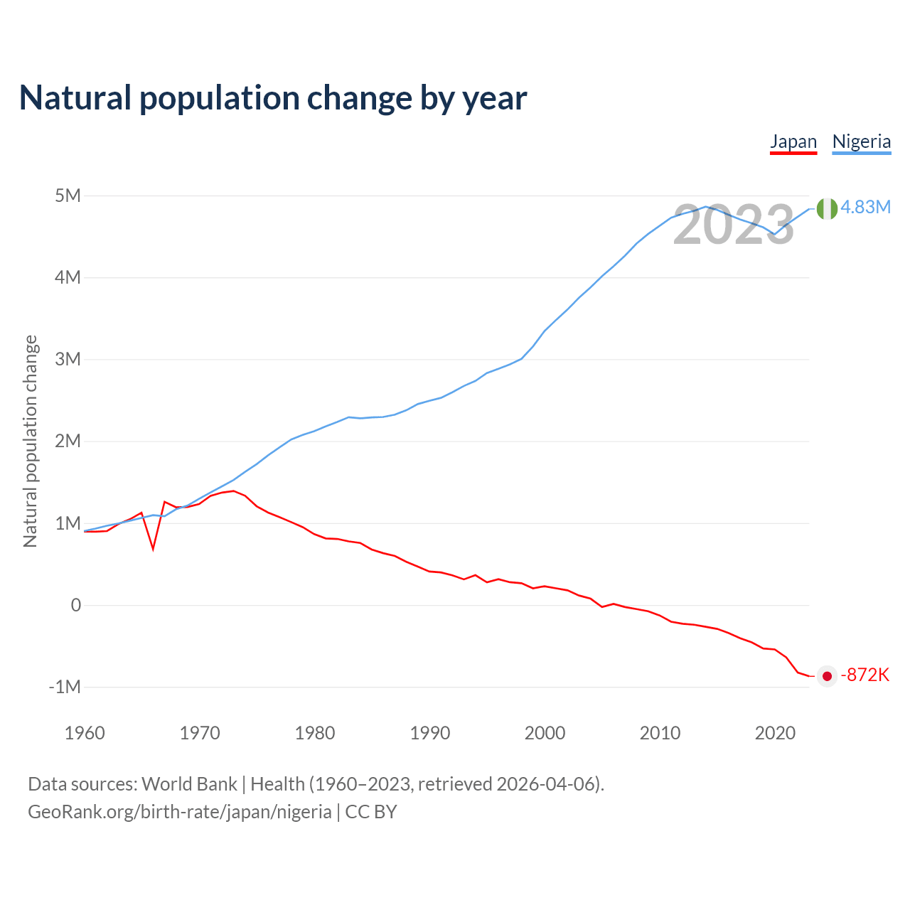 According to the latest available data on birth rates, the fertility rate in Japan was 1.2 children per woman in 2023, compared to 4.48 in Nigeria in 2023. The replacement level is considered to be 2.1 children per woman.