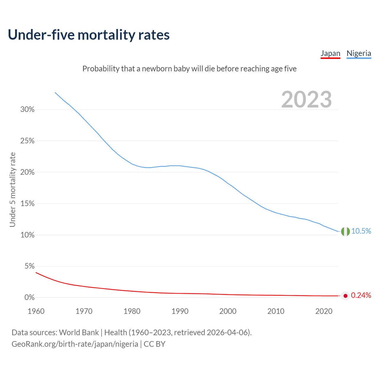 The chance that a newborn baby will die before reaching age five is 0.24% in Japan and 10.5% in Nigeria. Above is a chart with historical data on under-five mortality rates.