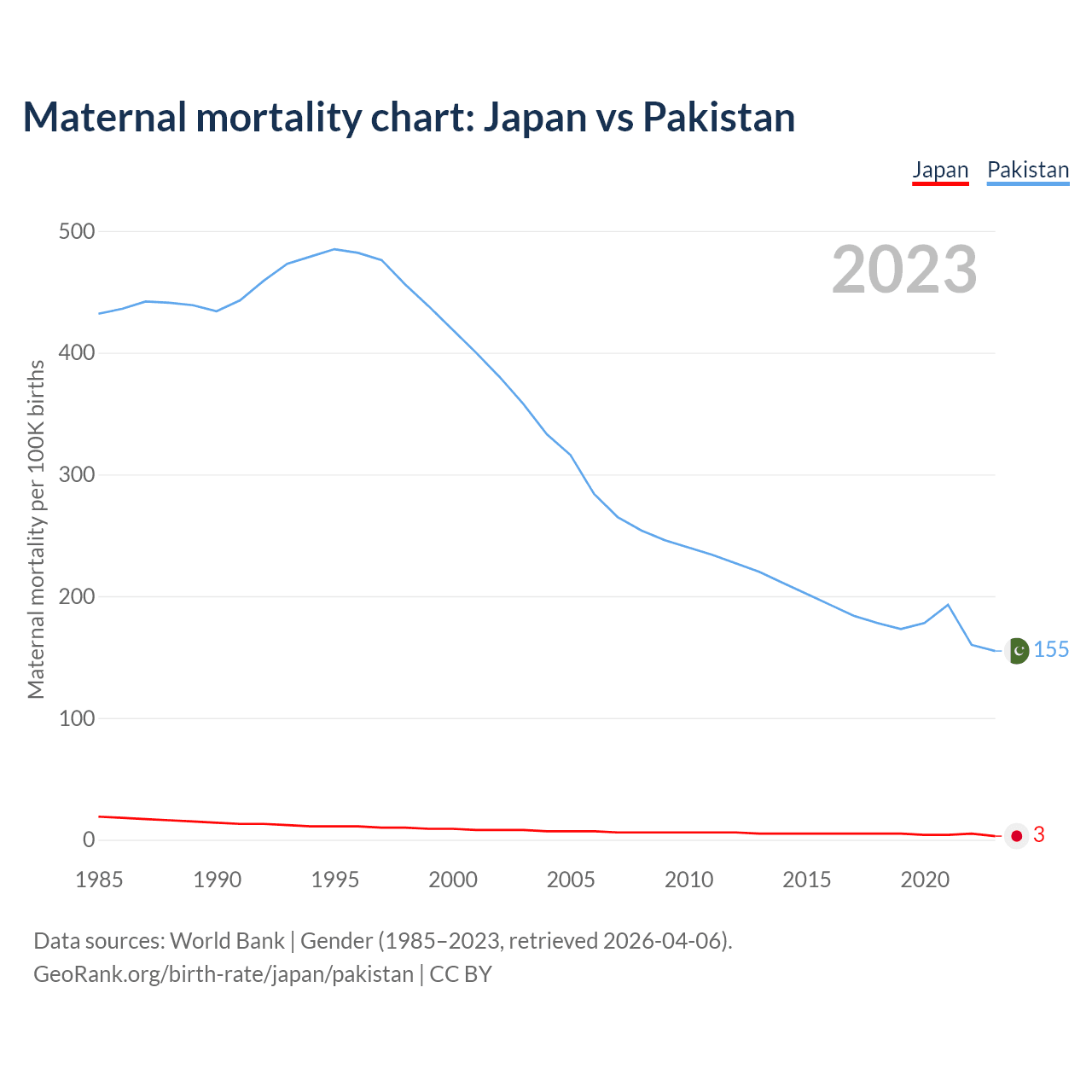 The maternal mortality rate, which is the probability of dying during childbirth or within 42 days of pregnancy termination, is 3 deaths per 100,000 live births in Japan, compared to 155 deaths in Pakistan.