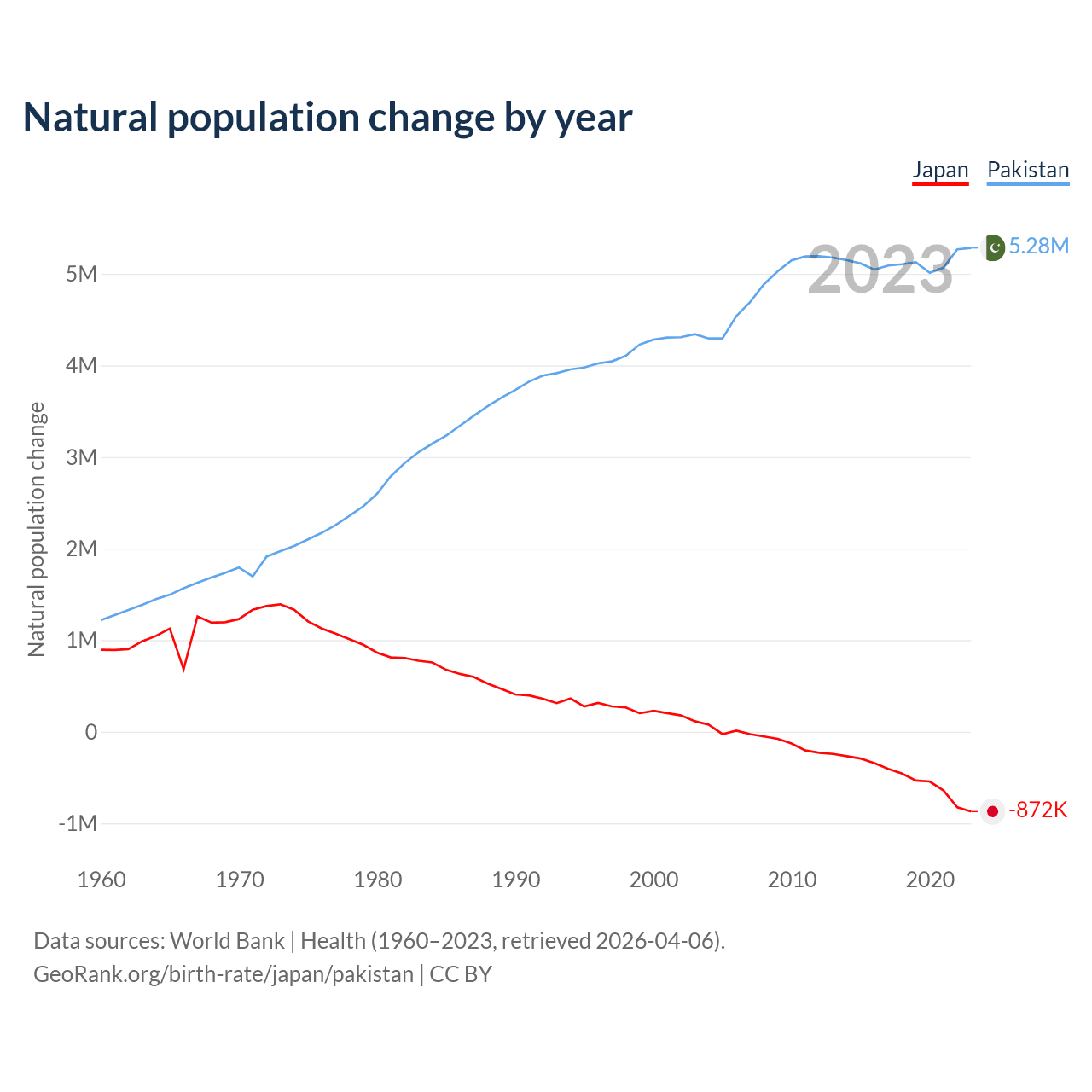 According to the latest available data on birth rates, the fertility rate in Japan was 1.2 children per woman in 2023, compared to 3.61 in Pakistan in 2023. The replacement level is considered to be 2.1 children per woman.