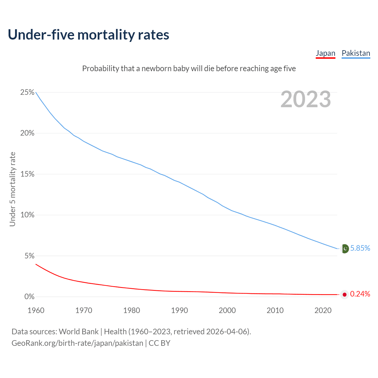 The chance that a newborn baby will die before reaching age five is 0.24% in Japan and 5.85% in Pakistan. Above is a chart with historical data on under-five mortality rates.
