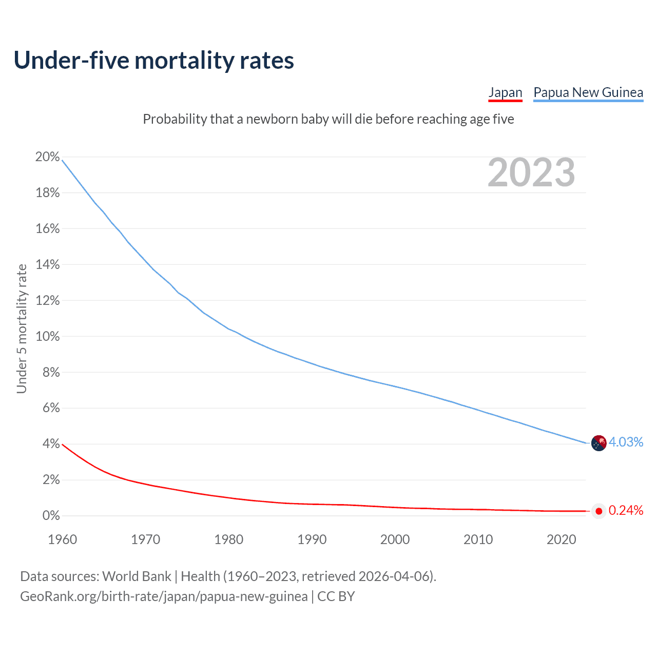 The chance that a newborn baby will die before reaching age five is 0.24% in Japan and 4.03% in Papua New Guinea. Above is a chart with historical data on under-five mortality rates.