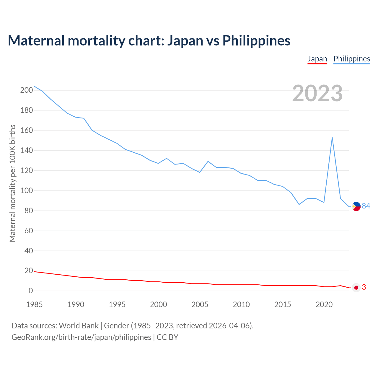 The maternal mortality rate, which is the probability of dying during childbirth or within 42 days of pregnancy termination, is 3 deaths per 100,000 live births in Japan, compared to 84 deaths in the Philippines.