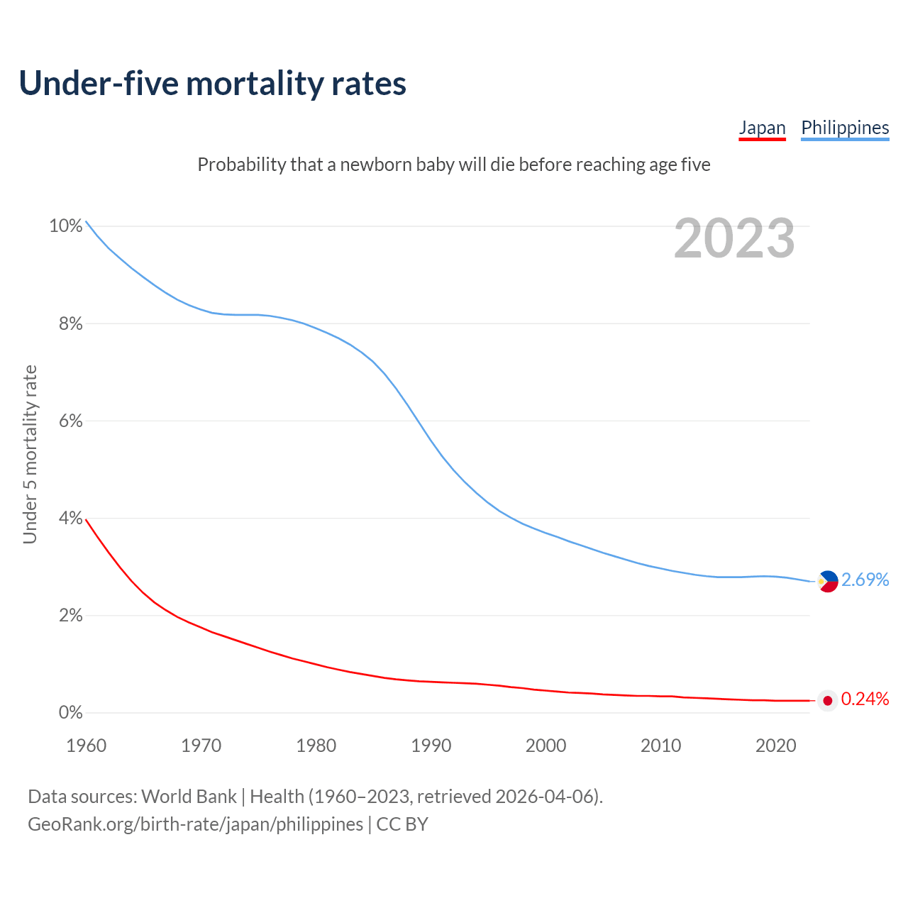 The chance that a newborn baby will die before reaching age five is 0.24% in Japan and 2.69% in the Philippines. Above is a chart with historical data on under-five mortality rates.
