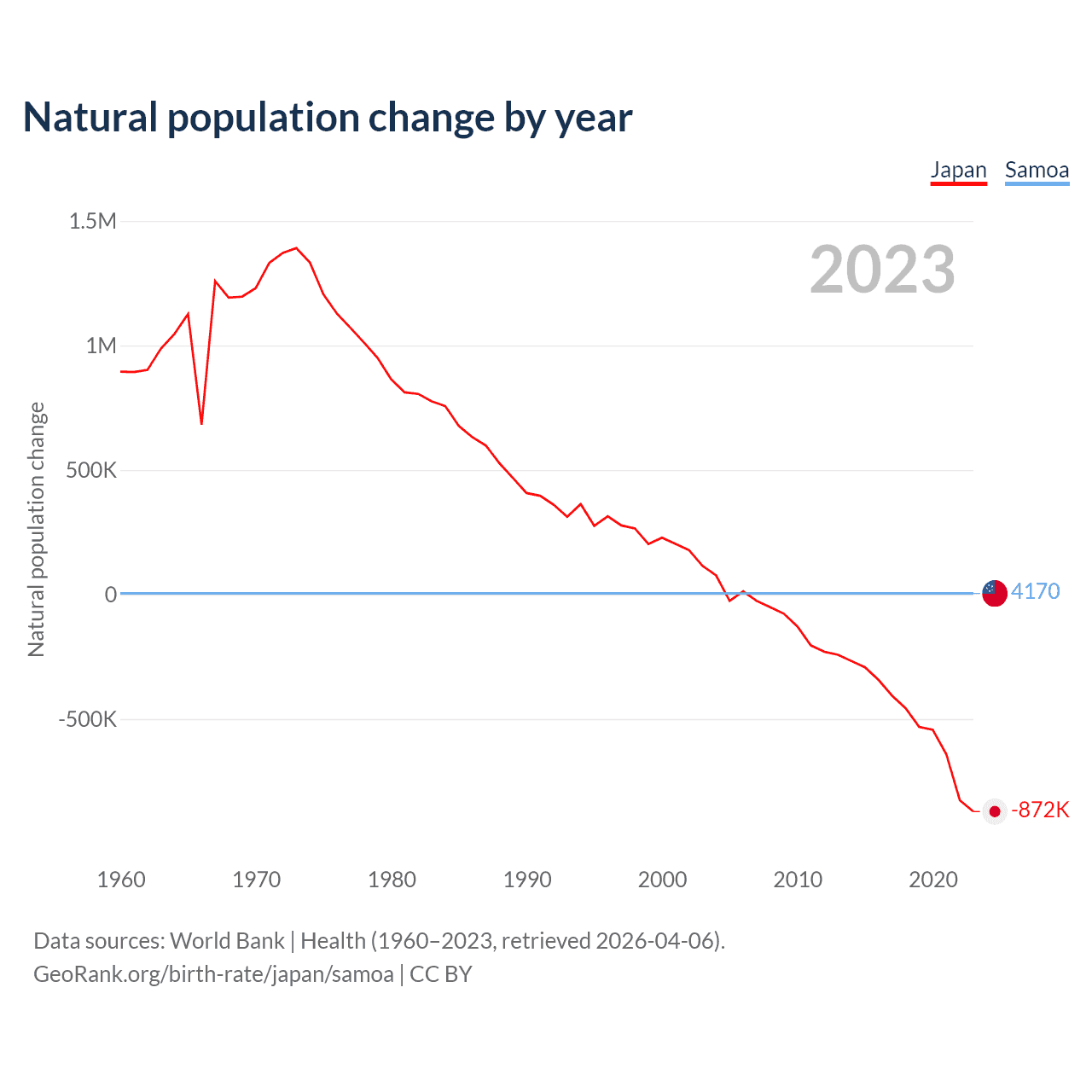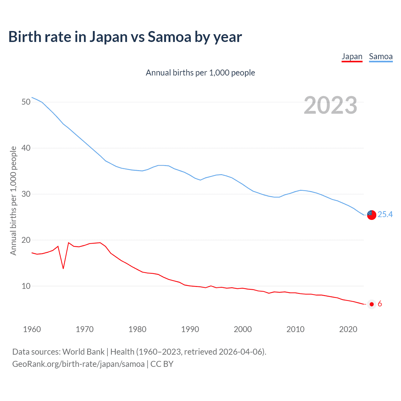 Japan has an annual birth rate of 6 births per 1,000 people, compared to 25.4 for Samoa. The average number of children a woman is expected to have during her lifetime — the fertility rate, is 1.2 in Japan and 3.83 in Samoa — 219.1% difference.