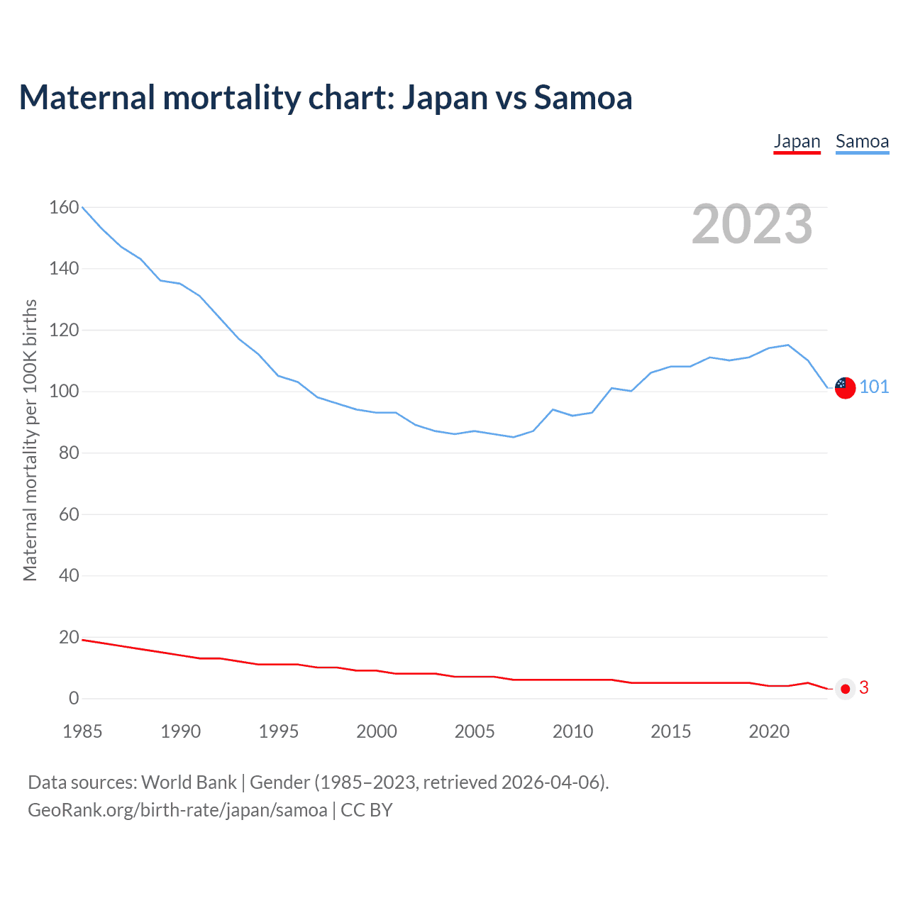 The maternal mortality rate, which is the probability of dying during childbirth or within 42 days of pregnancy termination, is 3 deaths per 100,000 live births in Japan, compared to 101 deaths in Samoa.