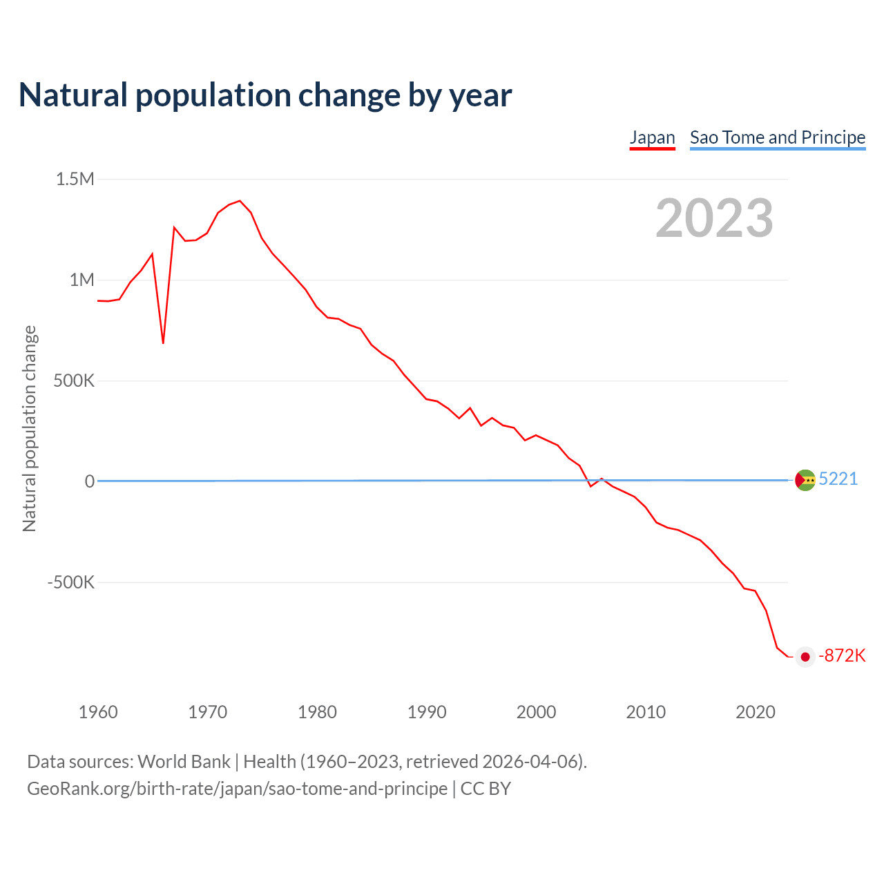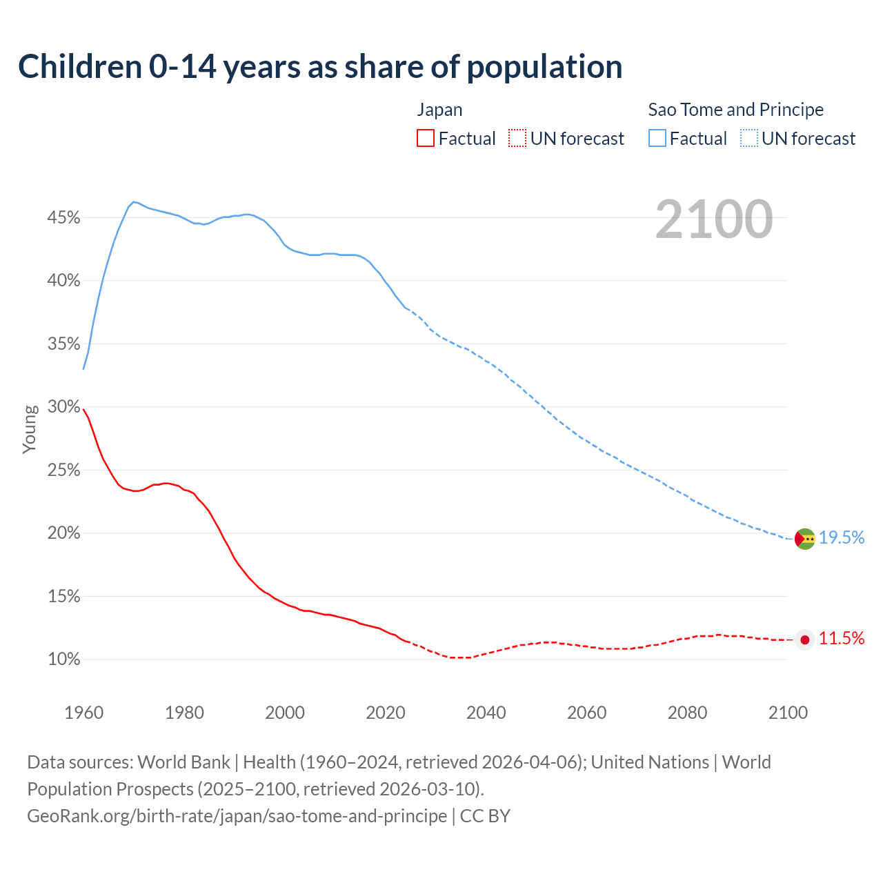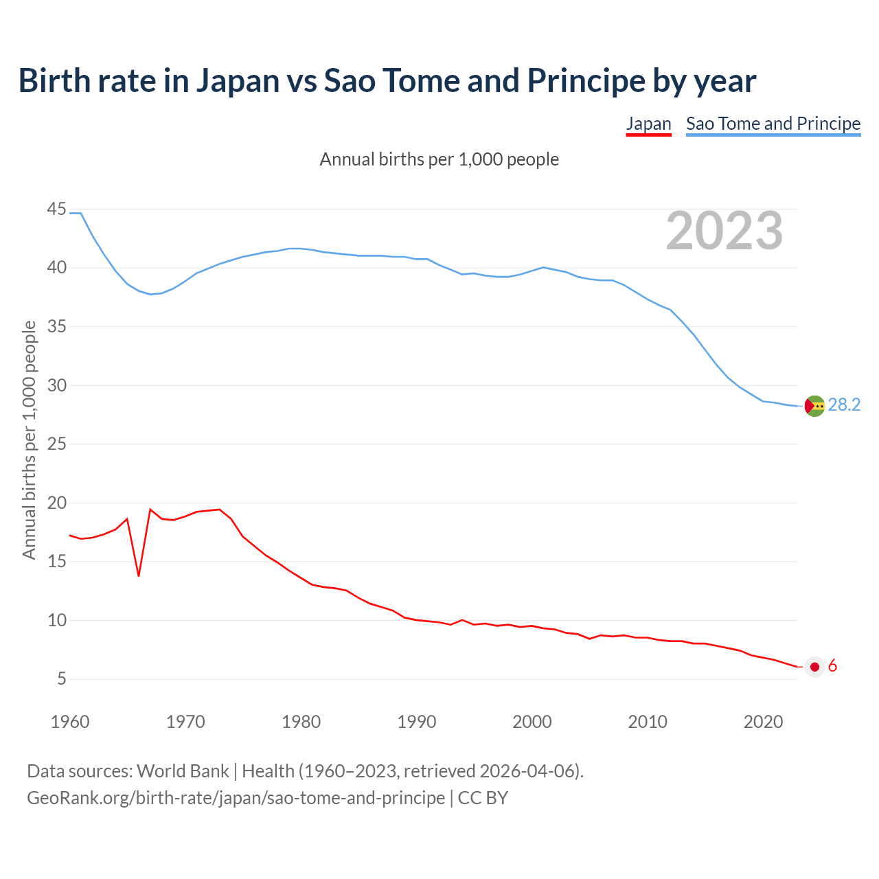 Japan has an annual birth rate of 6 births per 1,000 people, compared to 28.2 for Sao Tome and Principe. The average number of children a woman is expected to have during her lifetime — the fertility rate, is 1.2 in Japan and 3.64 in Sao Tome and Principe — 203.7% difference.