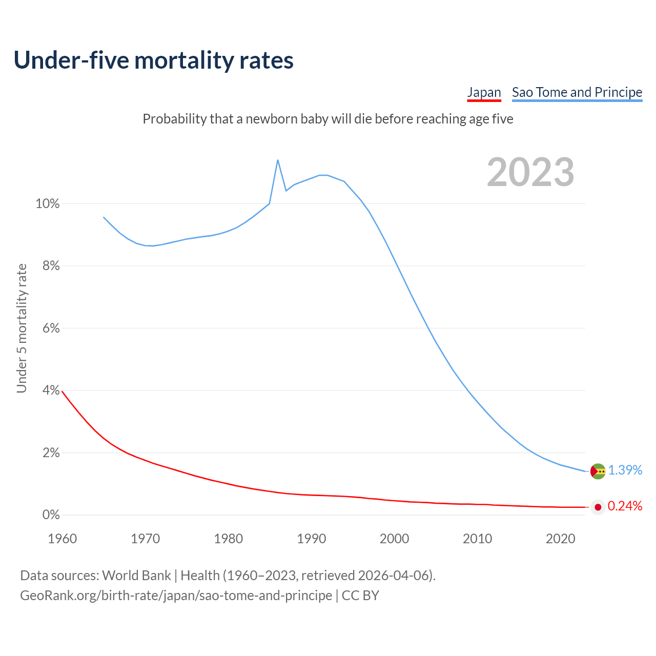 The chance that a newborn baby will die before reaching age five is 0.24% in Japan and 1.39% in Sao Tome and Principe. Above is a chart with historical data on under-five mortality rates.