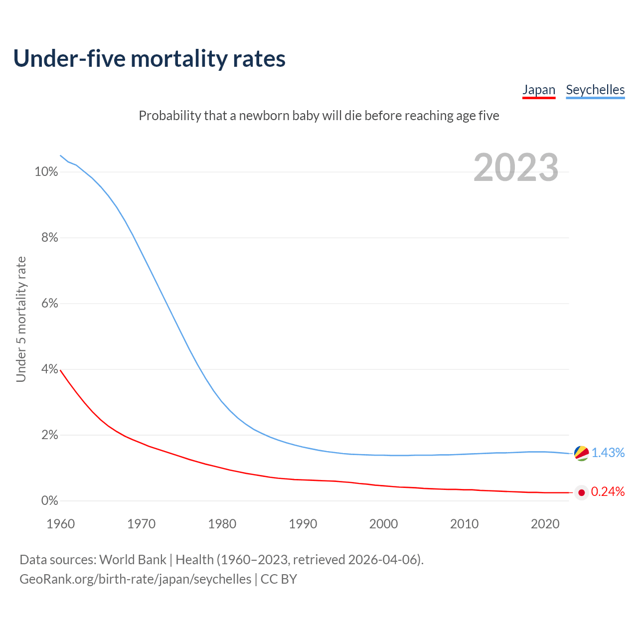The chance that a newborn baby will die before reaching age five is 0.24% in Japan and 1.43% in the Seychelles. Above is a chart with historical data on under-five mortality rates.