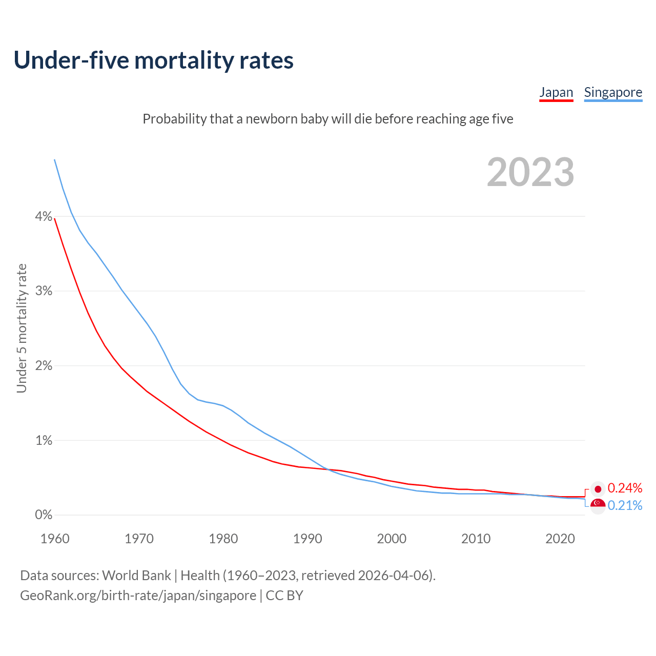 The chance that a newborn baby will die before reaching age five is 0.24% in Japan and 0.21% in Singapore. Above is a chart with historical data on under-five mortality rates.