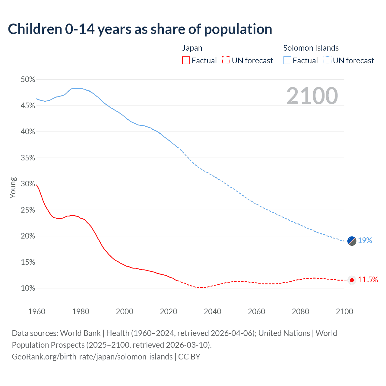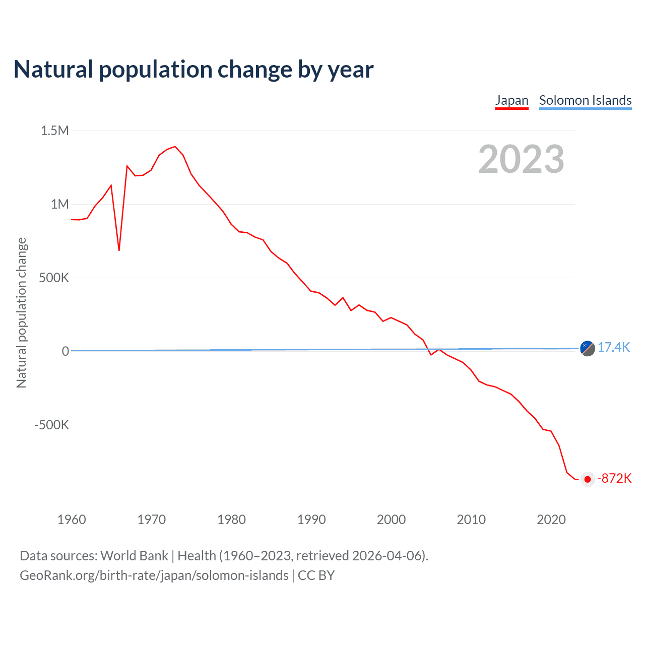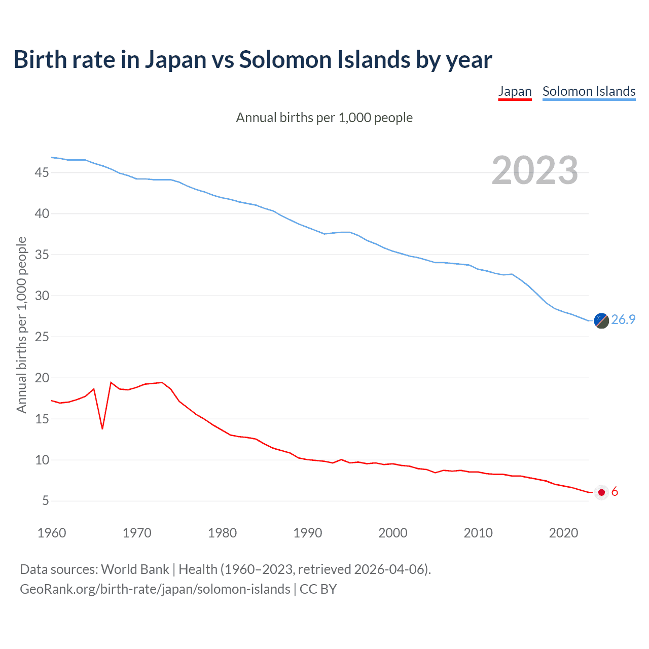 Japan has an annual birth rate of 6 births per 1,000 people, compared to 26.9 for the Solomon Islands. The average number of children a woman is expected to have during her lifetime — the fertility rate, is 1.2 in Japan and 3.56 in the Solomon Islands — 196.4% difference.