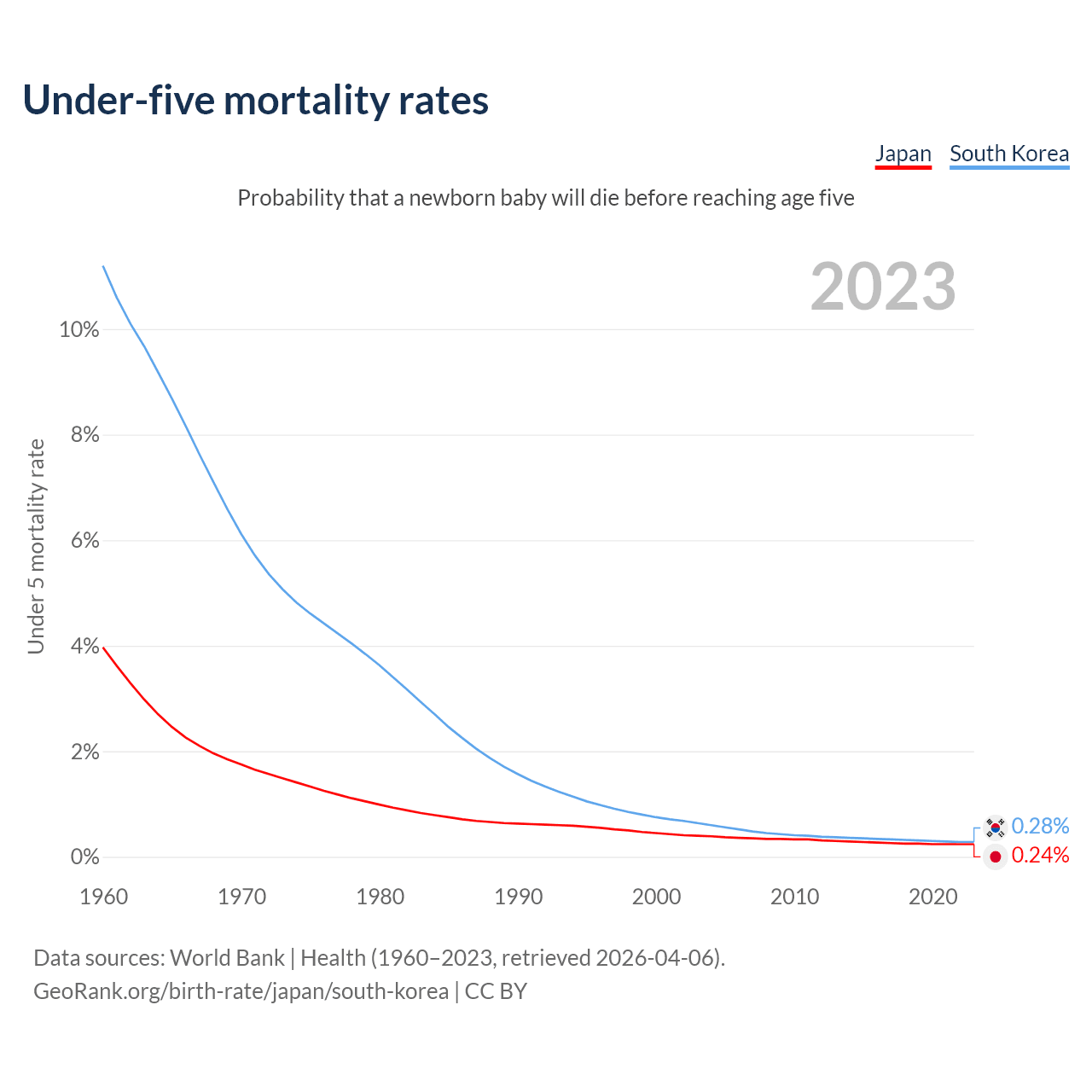 The chance that a newborn baby will die before reaching age five is 0.24% in Japan and 0.28% in South Korea. Above is a chart with historical data on under-five mortality rates.