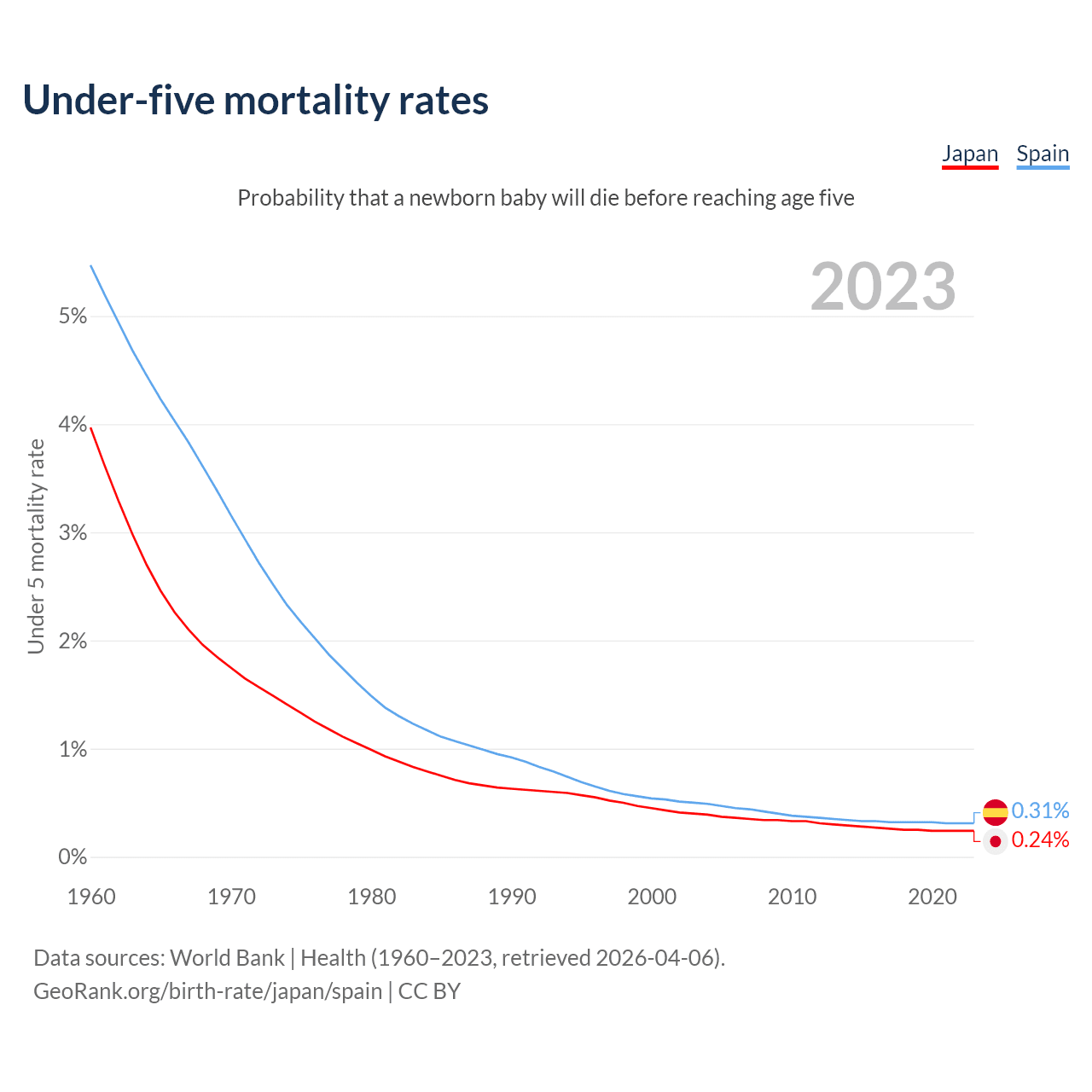 The chance that a newborn baby will die before reaching age five is 0.24% in Japan and 0.31% in Spain. Above is a chart with historical data on under-five mortality rates.