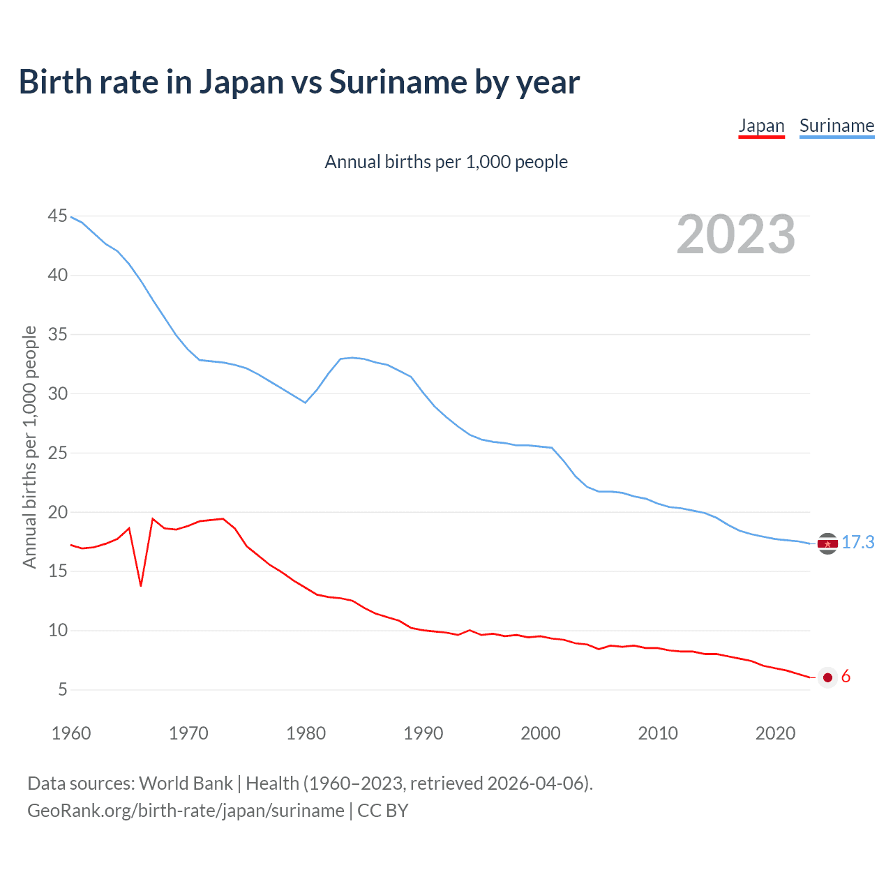 Japan has an annual birth rate of 6 births per 1,000 people, compared to 17.3 for Suriname. The average number of children a woman is expected to have during her lifetime — the fertility rate, is 1.2 in Japan and 2.25 in Suriname — 87.4% difference.
