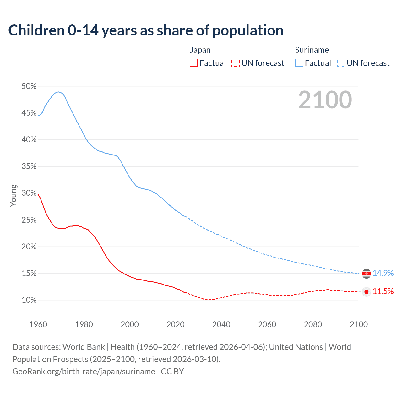 According to the latest available data on birth rates, the fertility rate in Japan was 1.2 children per woman in 2023, compared to 2.25 in Suriname in 2023. The replacement level is considered to be 2.1 children per woman.