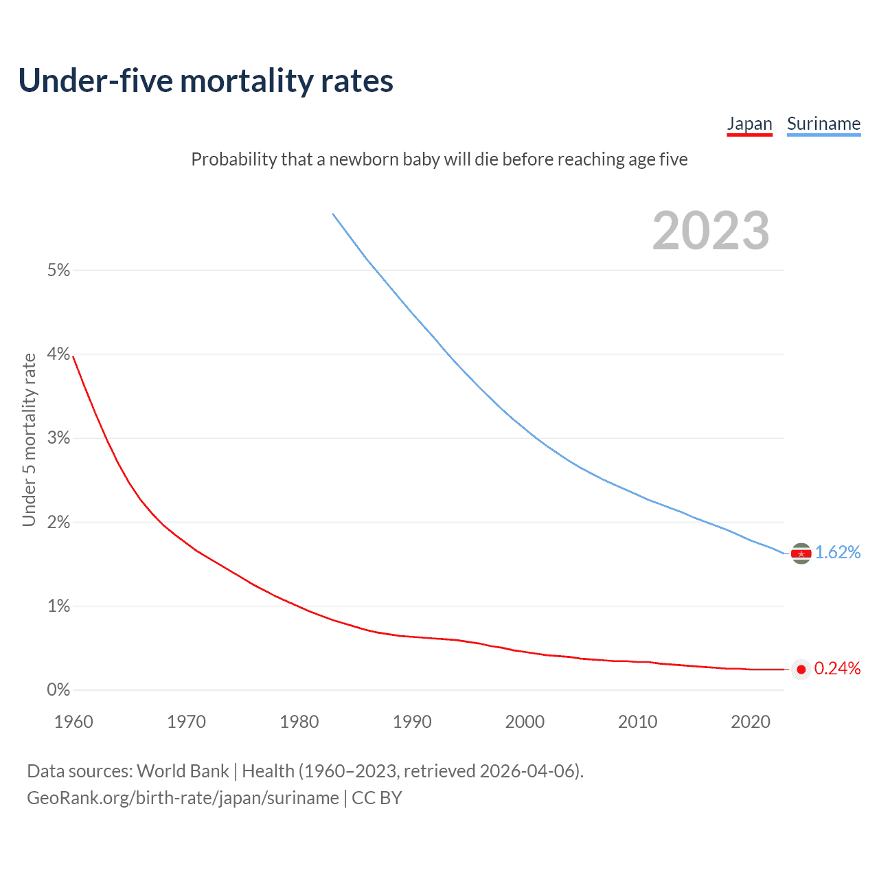 The chance that a newborn baby will die before reaching age five is 0.24% in Japan and 1.62% in Suriname. Above is a chart with historical data on under-five mortality rates.