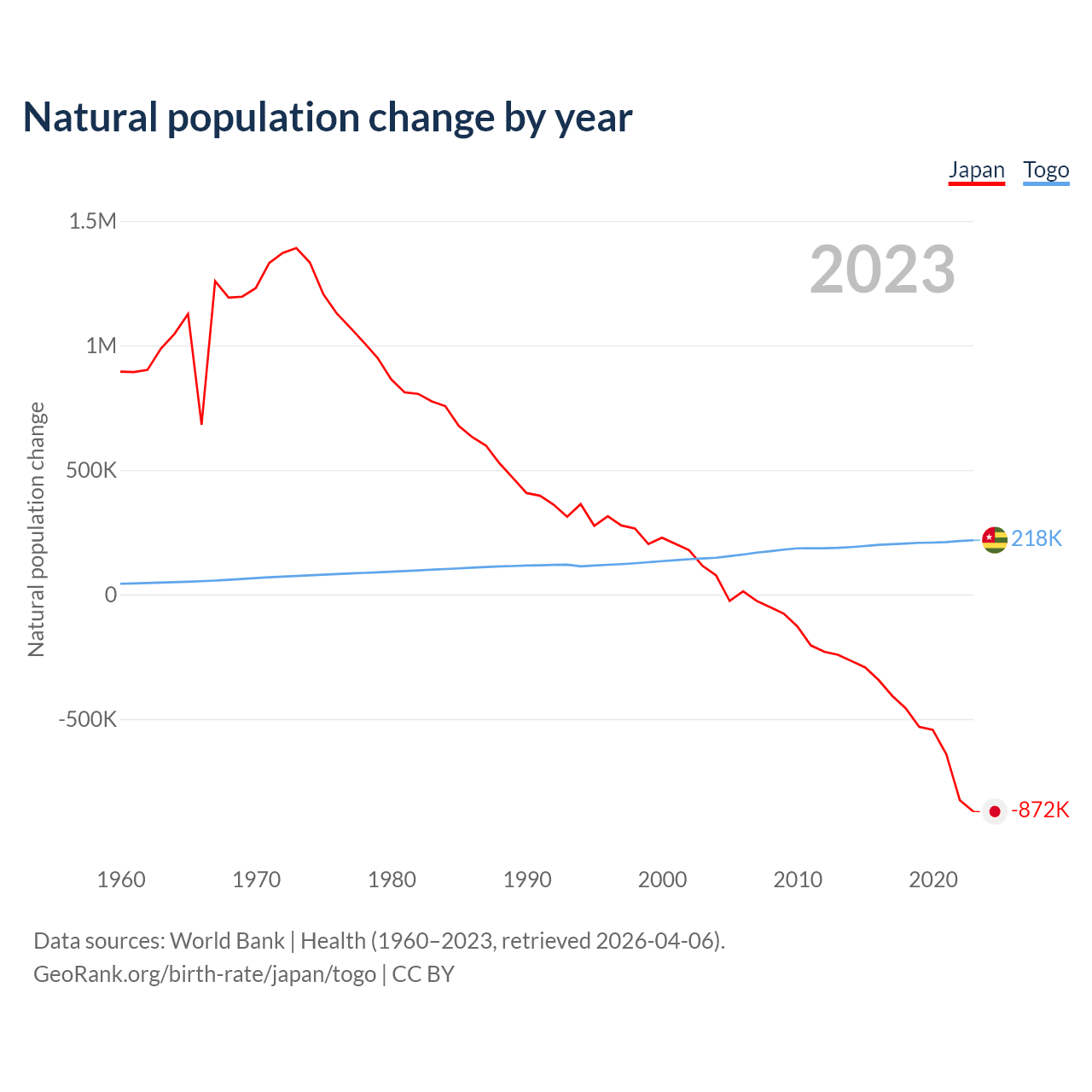 Japan has an annual birth rate of 6 births per 1,000 people, compared to 31.1 for Togo. The average number of children a woman is expected to have during her lifetime — the fertility rate, is 1.2 in Japan and 4.19 in Togo — 249.3% difference.