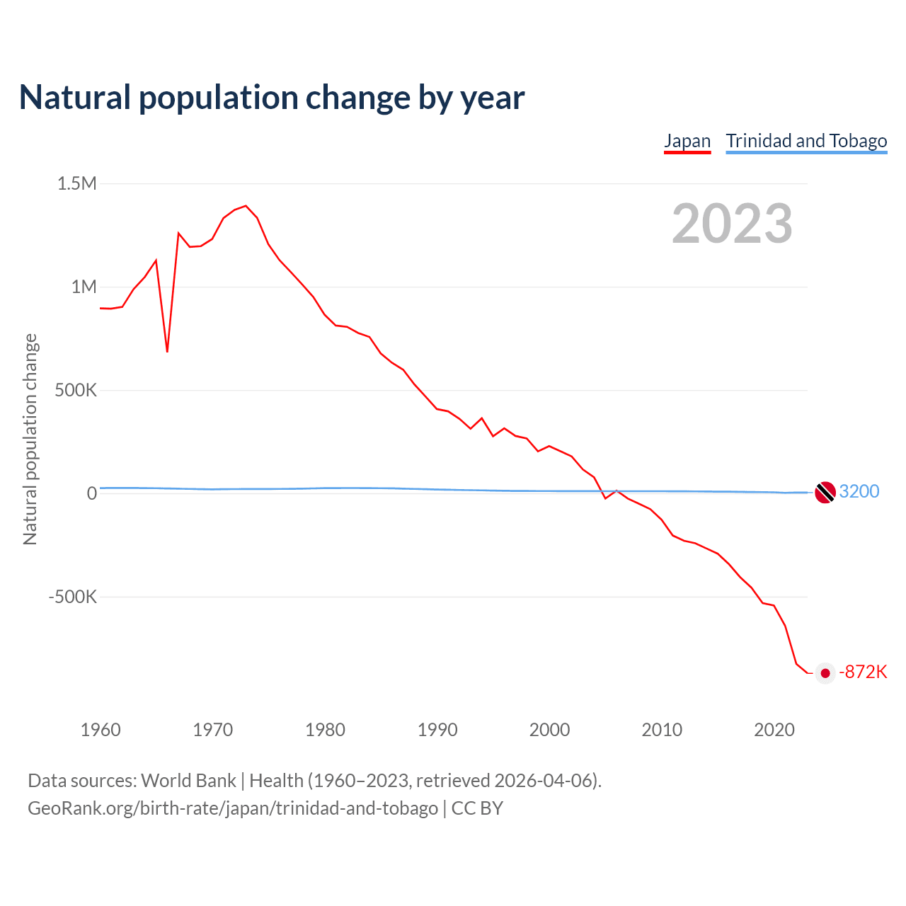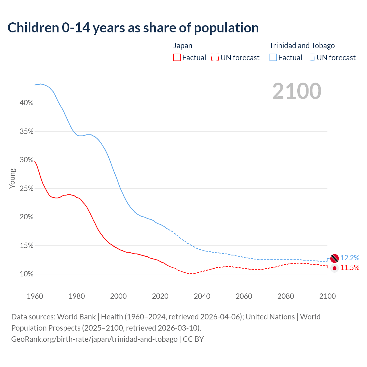 Japan has an annual birth rate of 6 births per 1,000 people, compared to 10.7 for Trinidad and Tobago. The average number of children a woman is expected to have during her lifetime — the fertility rate, is 1.2 in Japan and 1.53 in Trinidad and Tobago — 27.7% difference.
