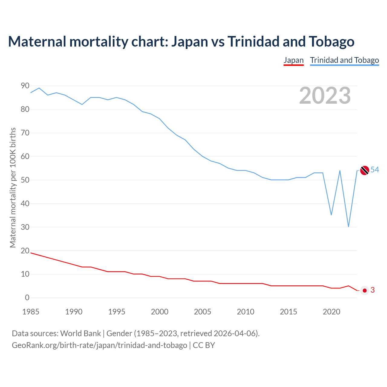 The maternal mortality rate, which is the probability of dying during childbirth or within 42 days of pregnancy termination, is 3 deaths per 100,000 live births in Japan, compared to 54 deaths in Trinidad and Tobago.