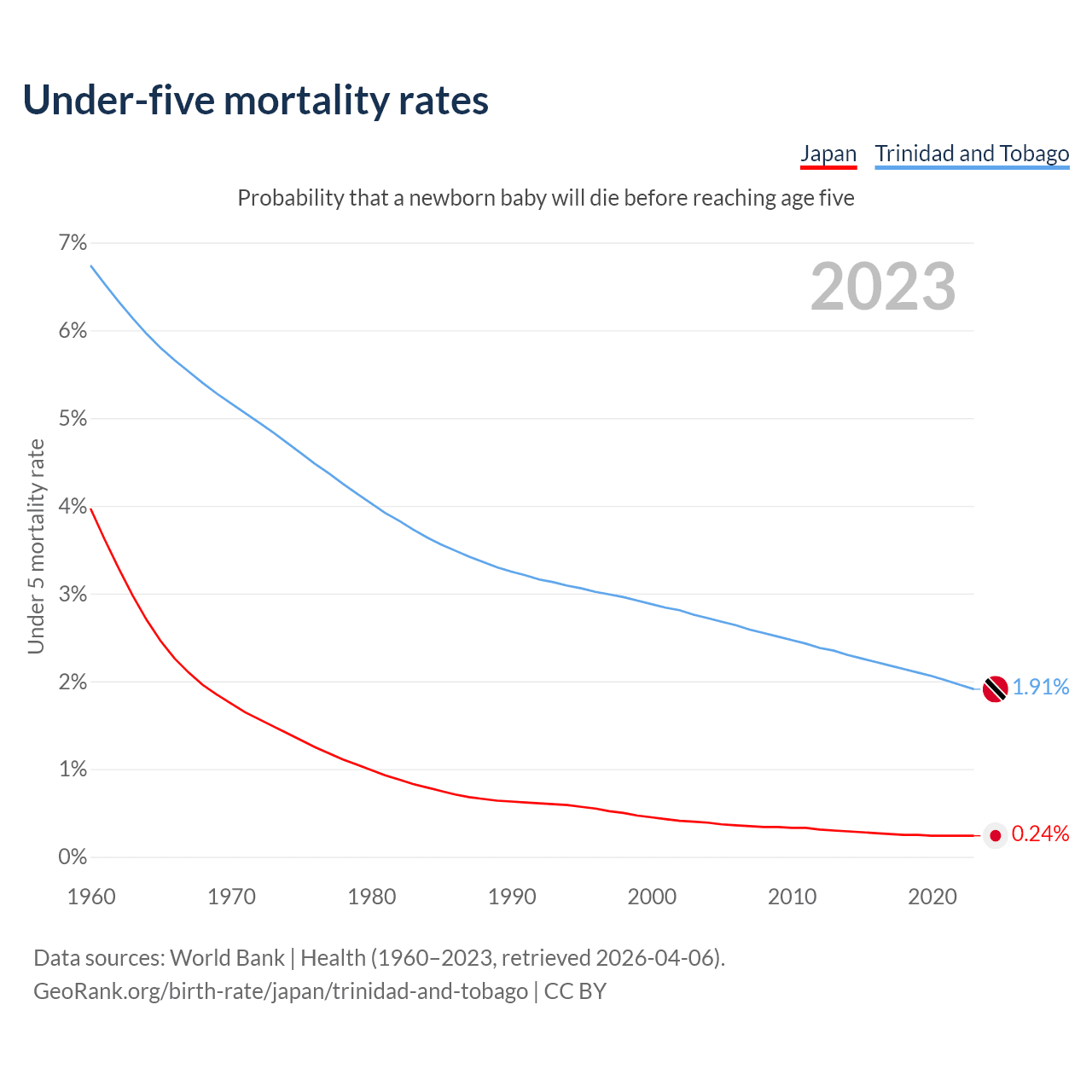 The chance that a newborn baby will die before reaching age five is 0.24% in Japan and 1.91% in Trinidad and Tobago. Above is a chart with historical data on under-five mortality rates.