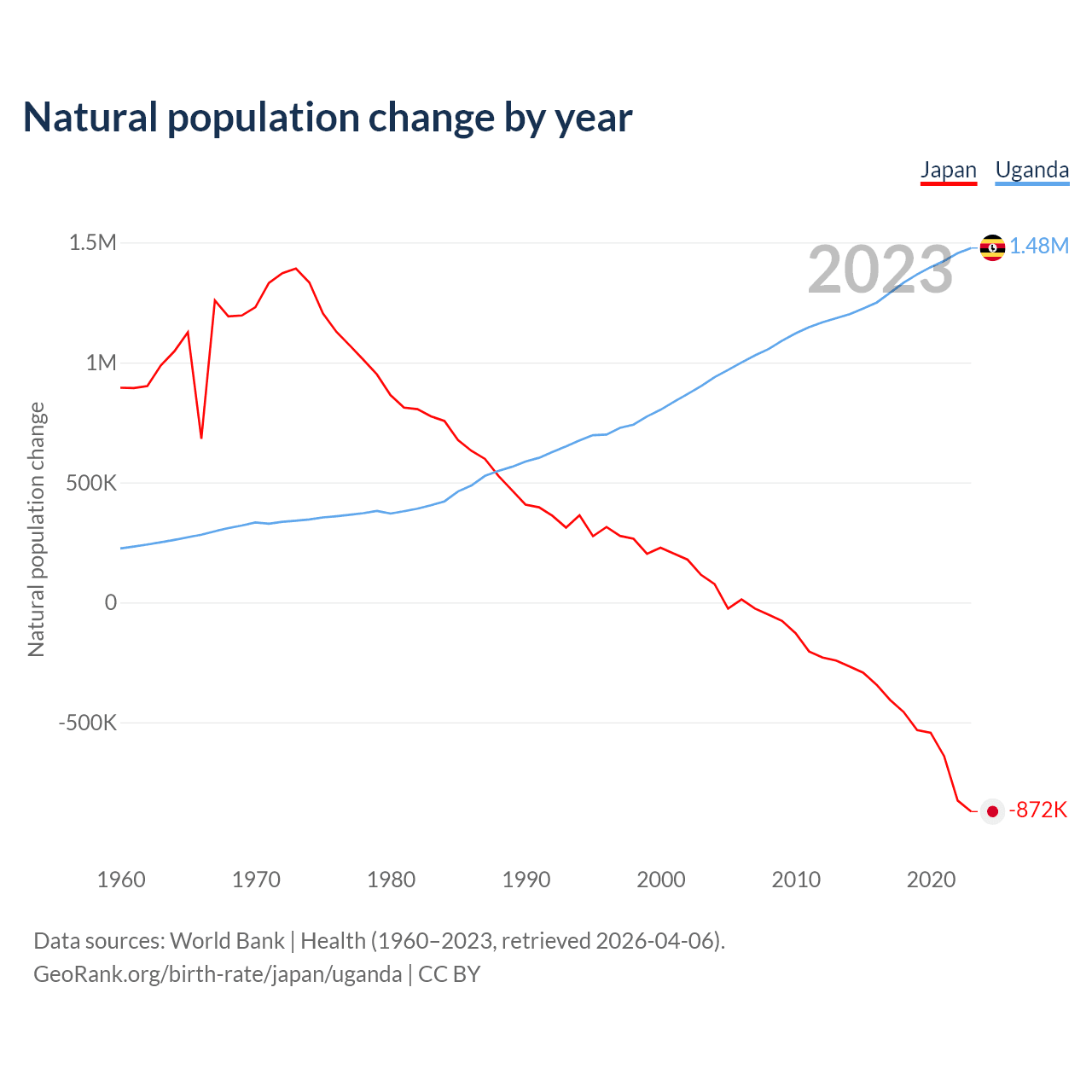 According to the latest available data on birth rates, the fertility rate in Japan was 1.2 children per woman in 2023, compared to 4.28 in Uganda in 2023. The replacement level is considered to be 2.1 children per woman.