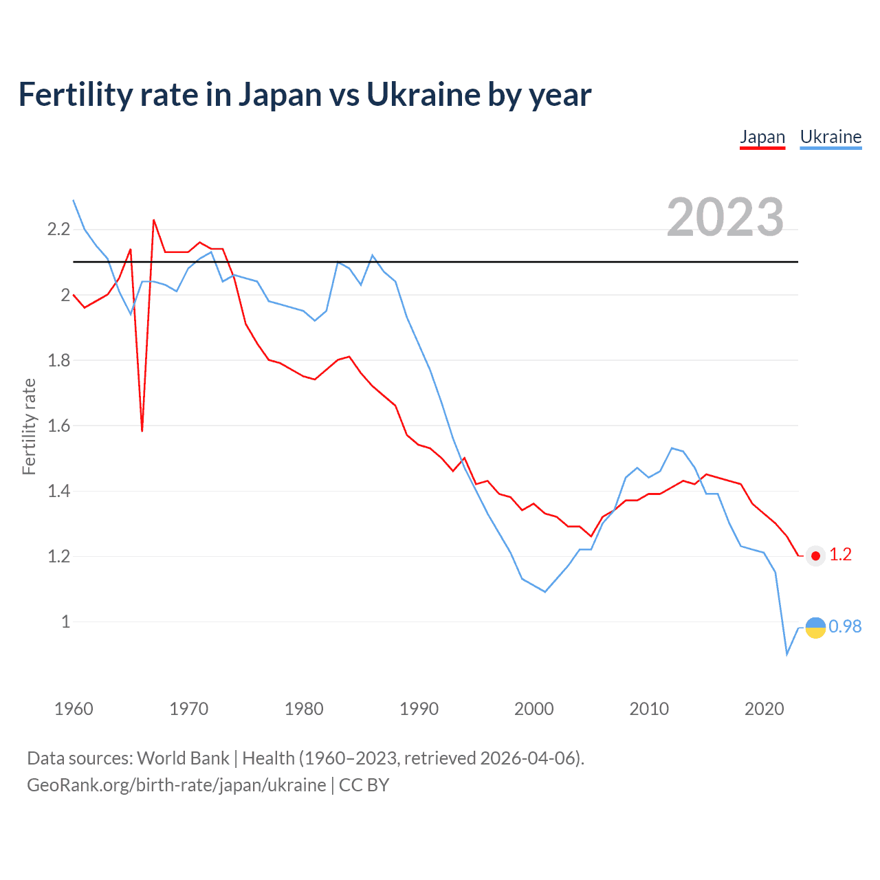 According to the latest available data on birth rates, the fertility rate in Japan was 1.2 children per woman in 2023, compared to 0.98 in Ukraine in 2023. The replacement level is considered to be 2.1 children per woman.
