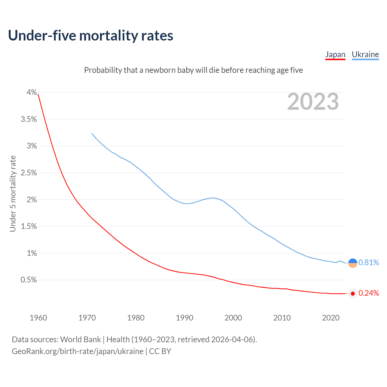 The chance that a newborn baby will die before reaching age five is 0.24% in Japan and 0.81% in Ukraine. Above is a chart with historical data on under-five mortality rates.