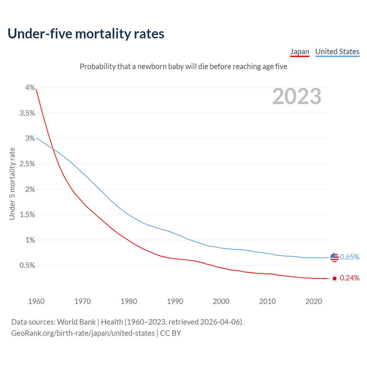 The chance that a newborn baby will die before reaching age five is 0.24% in Japan and 0.65% in the United States. Above is a chart with historical data on under-five mortality rates.