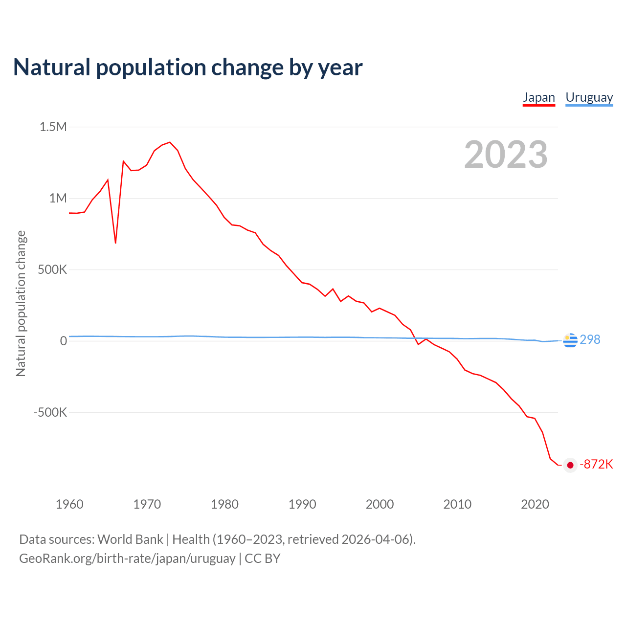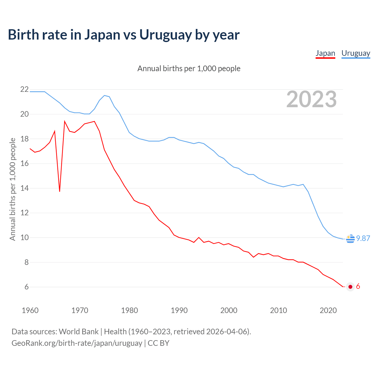 Japan has an annual birth rate of 6 births per 1,000 people, compared to 9.87 for Uruguay. The average number of children a woman is expected to have during her lifetime — the fertility rate, is 1.2 in Japan and 1.41 in Uruguay — 17.4% difference.