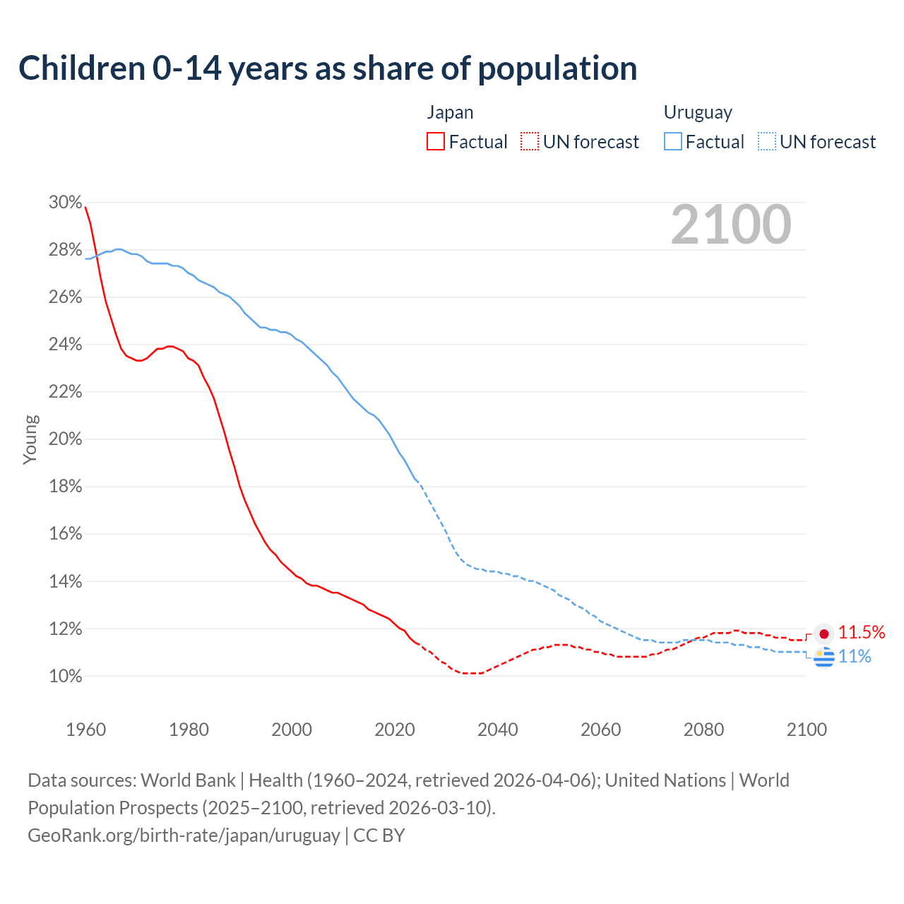 According to the latest available data on birth rates, the fertility rate in Japan was 1.2 children per woman in 2023, compared to 1.41 in Uruguay in 2023. The replacement level is considered to be 2.1 children per woman.