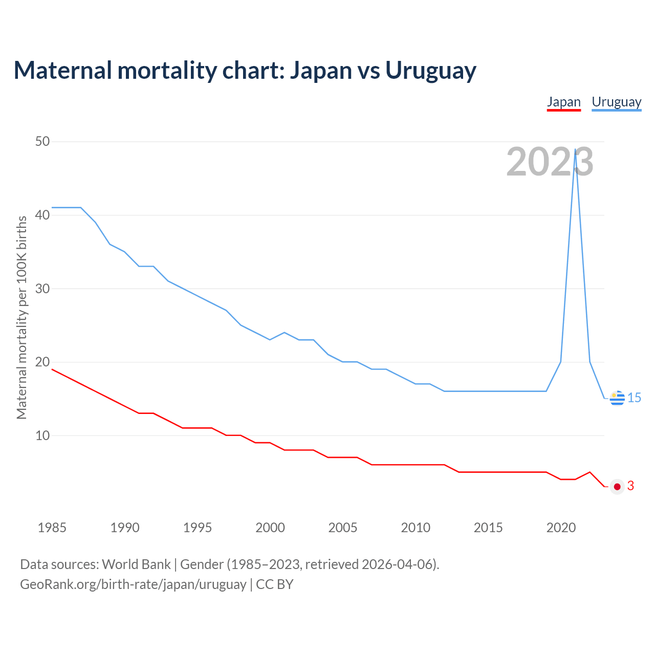The maternal mortality rate, which is the probability of dying during childbirth or within 42 days of pregnancy termination, is 3 deaths per 100,000 live births in Japan, compared to 15 deaths in Uruguay.