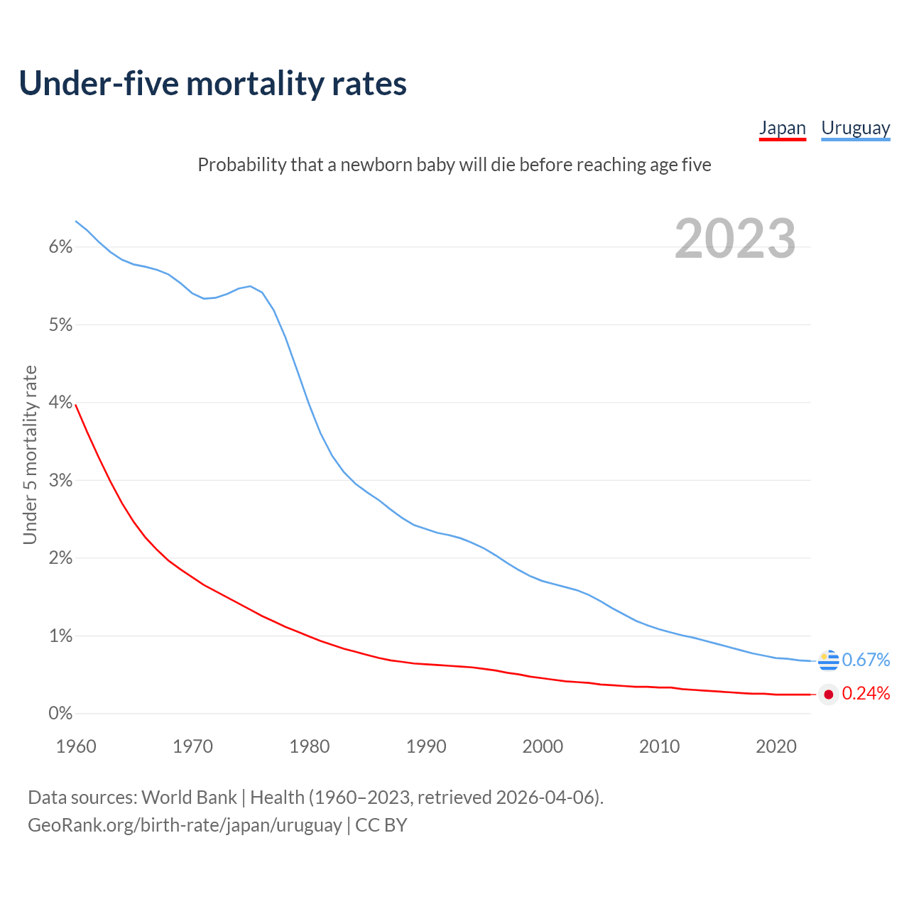 The chance that a newborn baby will die before reaching age five is 0.24% in Japan and 0.67% in Uruguay. Above is a chart with historical data on under-five mortality rates.
