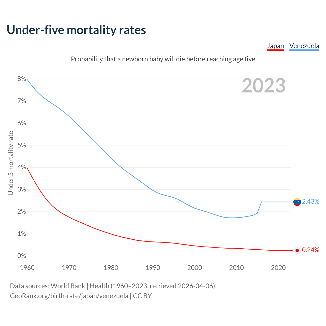 The chance that a newborn baby will die before reaching age five is 0.24% in Japan and 2.43% in Venezuela. Above is a chart with historical data on under-five mortality rates.