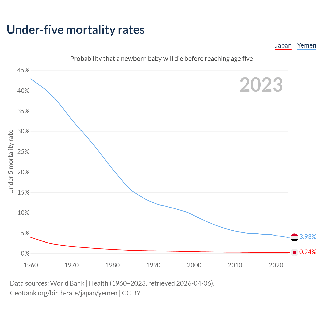 The chance that a newborn baby will die before reaching age five is 0.24% in Japan and 3.93% in Yemen. Above is a chart with historical data on under-five mortality rates.