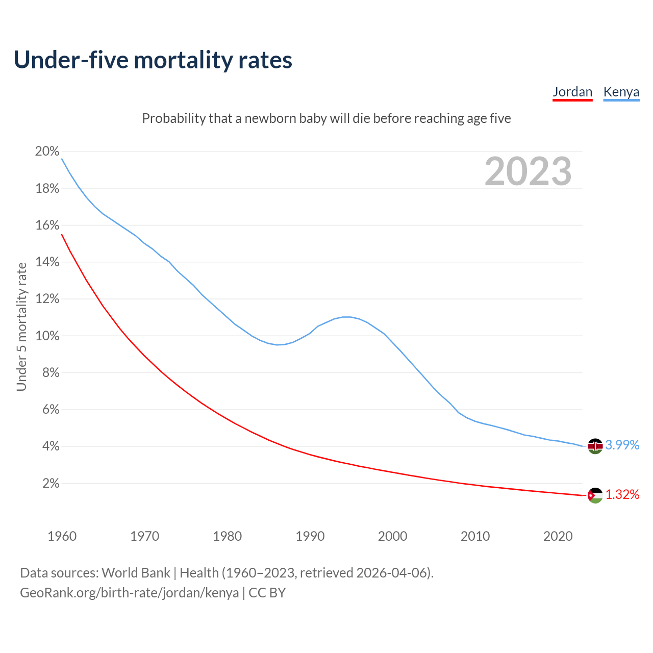 The chance that a newborn baby will die before reaching age five is 1.32% in Jordan and 3.99% in Kenya. Above is a chart with historical data on under-five mortality rates.