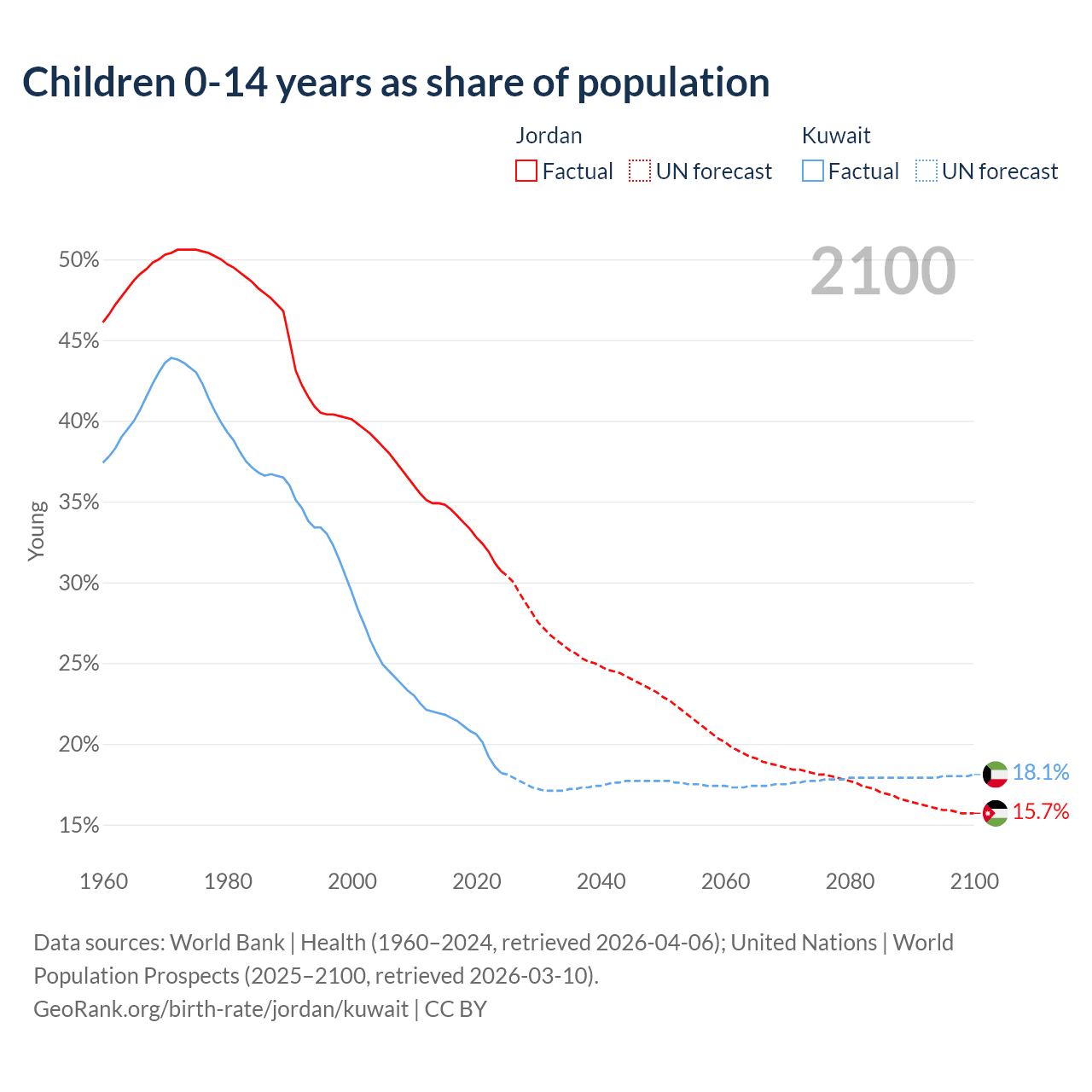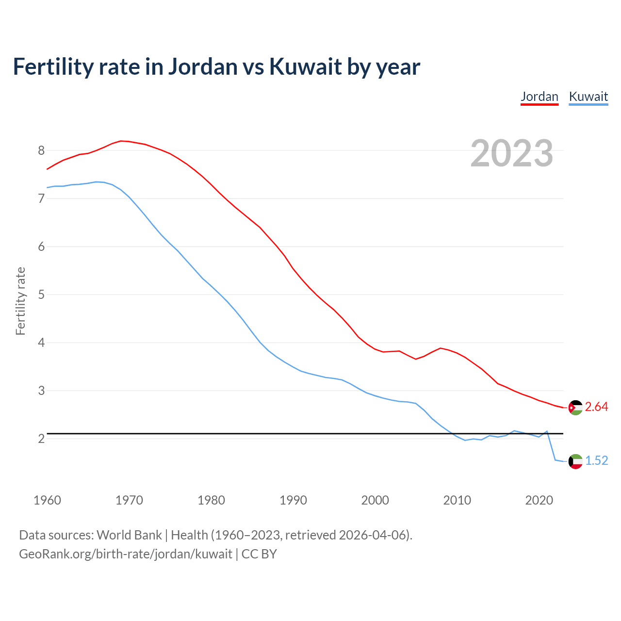 According to the latest available data on birth rates, the fertility rate in Jordan was 2.64 children per woman in 2023, compared to 1.52 in Kuwait in 2023. The replacement level is considered to be 2.1 children per woman.