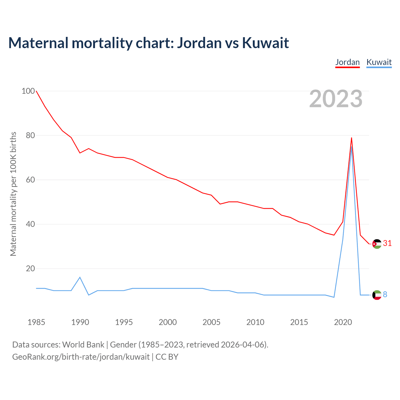 The maternal mortality rate, which is the probability of dying during childbirth or within 42 days of pregnancy termination, is 31 deaths per 100,000 live births in Jordan, compared to 8 deaths in Kuwait.